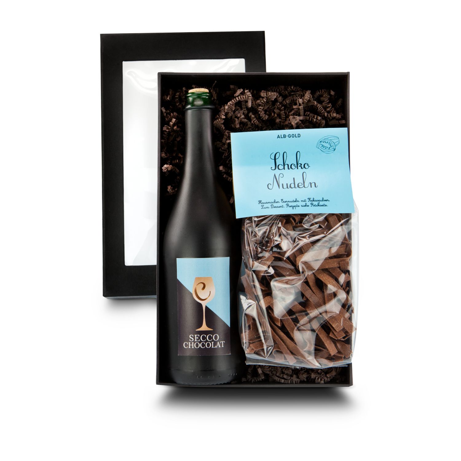 Ein überraschendes Schokodessert mal ganz anders! Die Schoko-Nudeln (250 g) werden in Milch gekocht und dann warm gegessen - dazu ein Glas Schoko-Secco aus der 0,75 l Flasche und das perfekte Dessert ist fertig. Beides liegt in schokobraunem Sizzle in einem Geschenkkarton mit Sichtfenster.