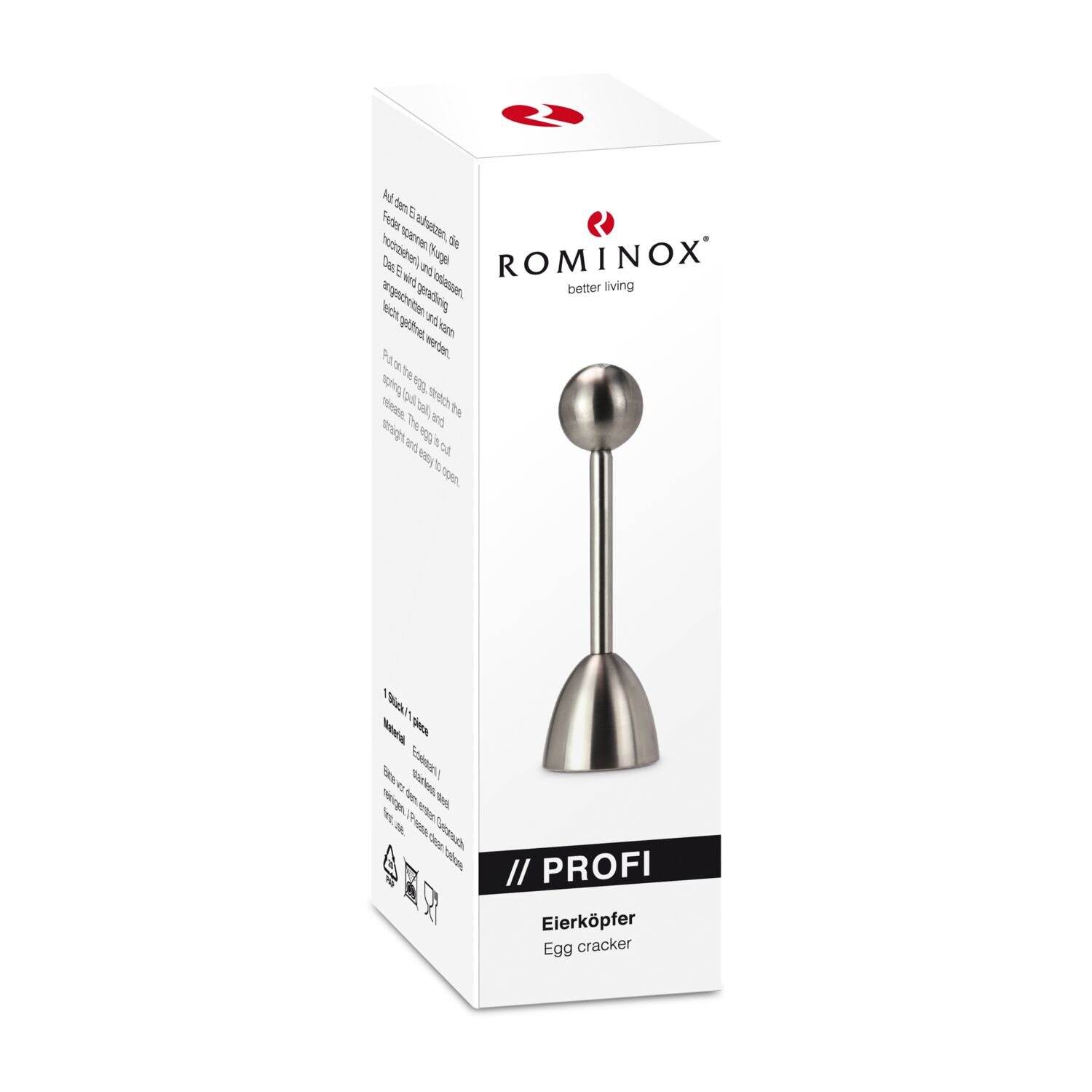 Mit dem charmanten Set "Frühstücks (dr) eierlei" beginnt der Start ins Wochenende mit Stil, Funktion und einem Augenzwinkern. Sie erhalten drei Dinge, die Sie für ein perfektes Frühstücksei brauchen: einen ROMINOX® Profi Eierköpfer, ein Glas mit feinem Meersalz (50 g) und ein Set aus vier eleganten ROMINOX® Minisalzstreuern. Sie brauchen nur noch ein perfekt gekochtes Ei. Die Salzstreuer haben eine moderne glänzende Oberfläche aus Edelstahl, sind einfach zu befüllen und haben einen transparenten Boden für eine einfache und schnelle Füllstandprüfung. Füllen Sie einfach das mitgelieferte Meersalz ein, um es fein dosiert auf Ihrem Frühstücksei zu verteilen. Damit Sie dieses stilvoll öffnen können, sorgt der ROMINOX® Eierköpfer aus Edelstahl mit praktischer integrierter Feder für eine klare Schnittkante ganz ohne Schalenkrümel. Die Utensilien für Ihr perfektes Frühstücksei kommen verpackt in einer edlen schwarzen Geschenkbox mit stimmungsvollem Frühstücksei-Aufkleber, welcher das Präsent zu einer stilvollen Liebeserklärung an die wichtigste Mahlzeit des Tages macht.