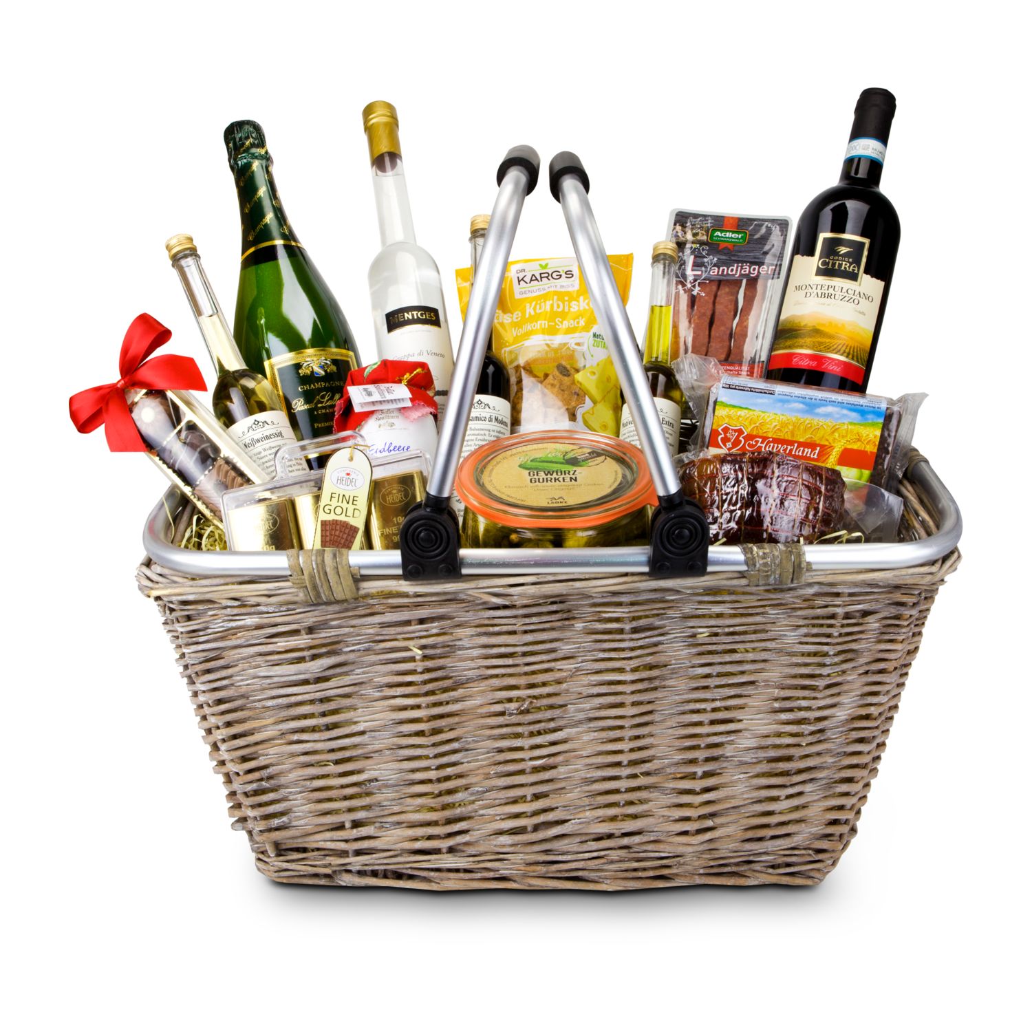 Sie möchten sich bei einem Mitarbeiter oder Geschäftspartner für eine außergewöhnliche Leistung bedanken oder ihm / ihr zu einem besonderen Jubiläum gratulieren? Dann treffen Sie mit diesem großen gefüllten Geschenkkorb garantiert den richtigen Geschmack: 1 Flasche Champagner (0,75 l), 1 Flasche Grappa (0,35 l), 1 Flasche Rotwein Monte Citra (0,75 l), 4 herzhafte Knacker (125 g), 1 Packung Vollkornbrot (500 g), 1 Schwarzwälderschinken (450 g), 1 Packung Käse-Kürbis Cracker (110 g), 1 Glas Gewürzgurken (580 ml), 1 Flasche Aceto Balsamico (100 ml), 1 Flasche Natives Olivenöl Extra (100 ml), 1 Flasche Weißweinessig (100 ml), 1 Erdbeer-Konfitüre / Marmelade (330 g), 1 Pralinenstange mit 5 Confiserie-Pralinen (60 g) und 1 Goldkoffer mit 12 Goldbarren aus Edelvollmilchschokolade (120 g). Alles ist verpackt in einem praktischen Einkaufskorb mit Tragegriffen, der auch nach Genuss der 14 leckeren Produkte noch lange gute Dienste leisten wird. (Produkte können je nach Saison und Verfügbarkeit durch gleichwertige Alternativen ersetzt werden)