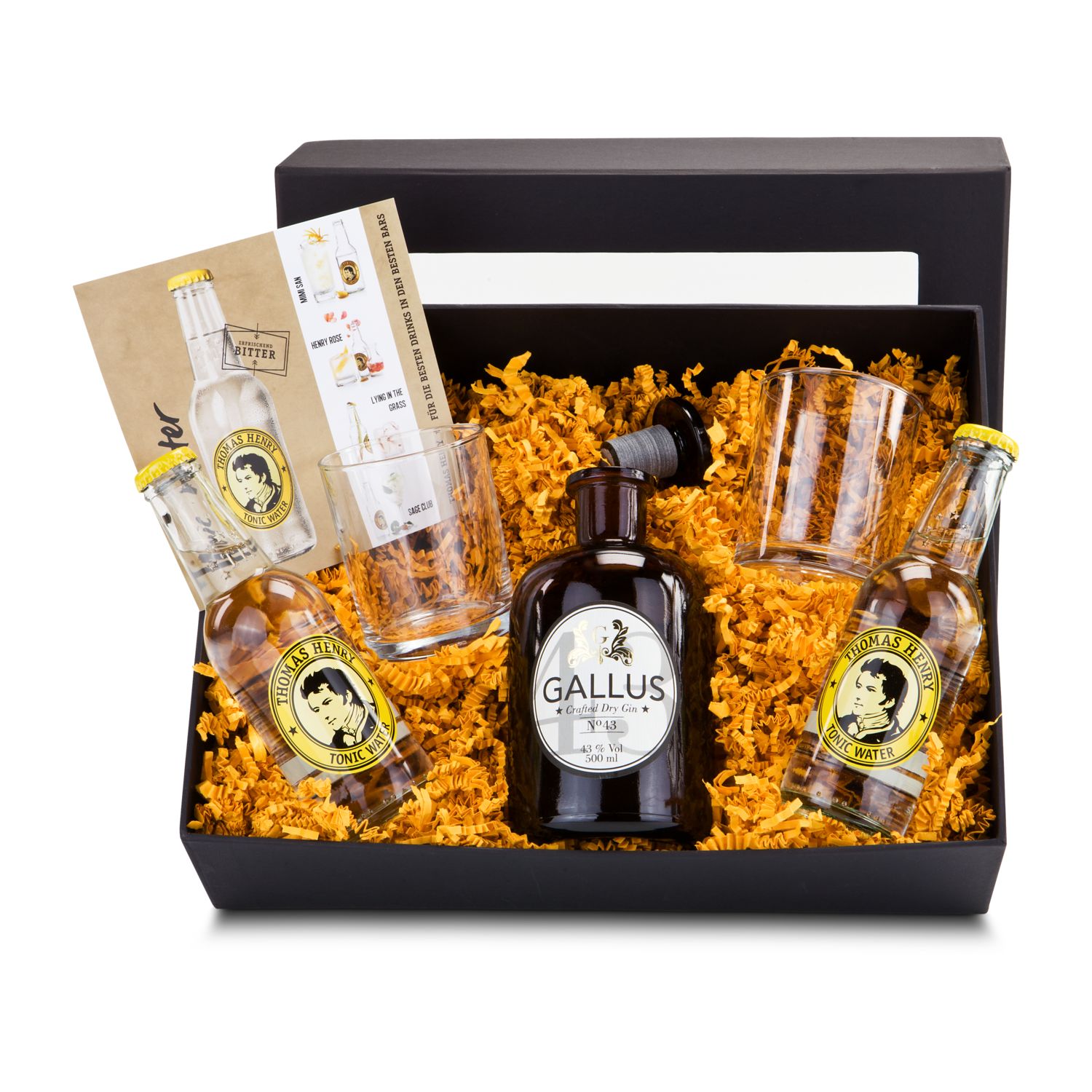 Ein exklusives Gin Tonic Set - etwas zum Entdecken, Schenken und Begeistern. Das absolute Trendgetränk in hochwertiger Kombination: Eine original braune Apothekerflasche mit 0,5 l Gin Gallus Nº 43 und Glaskorken zum Wiederverschließen. Mit im Set liegen 2 Flaschen Tonic von Thomas Henry (à 0,2 l), eine Marke, die ebenfalls in Apothekertradition steht und daher perfekt zu unserem Gallus Gin passt. Dazu ein Rezept-Flyer mit Anregungen und 2 spezielle Gin Tonic Gläser. Im schwarzen Sichtfensterkarton. Das macht vom ersten Moment an Spaß!