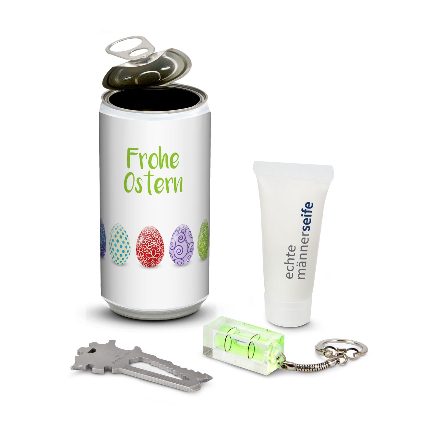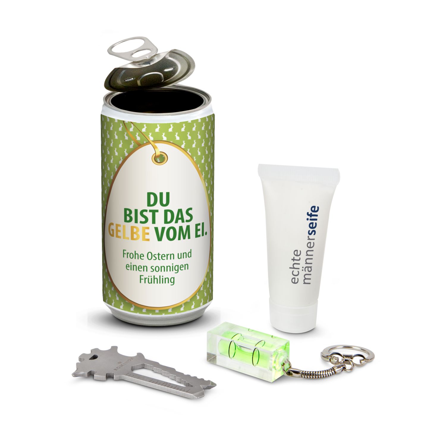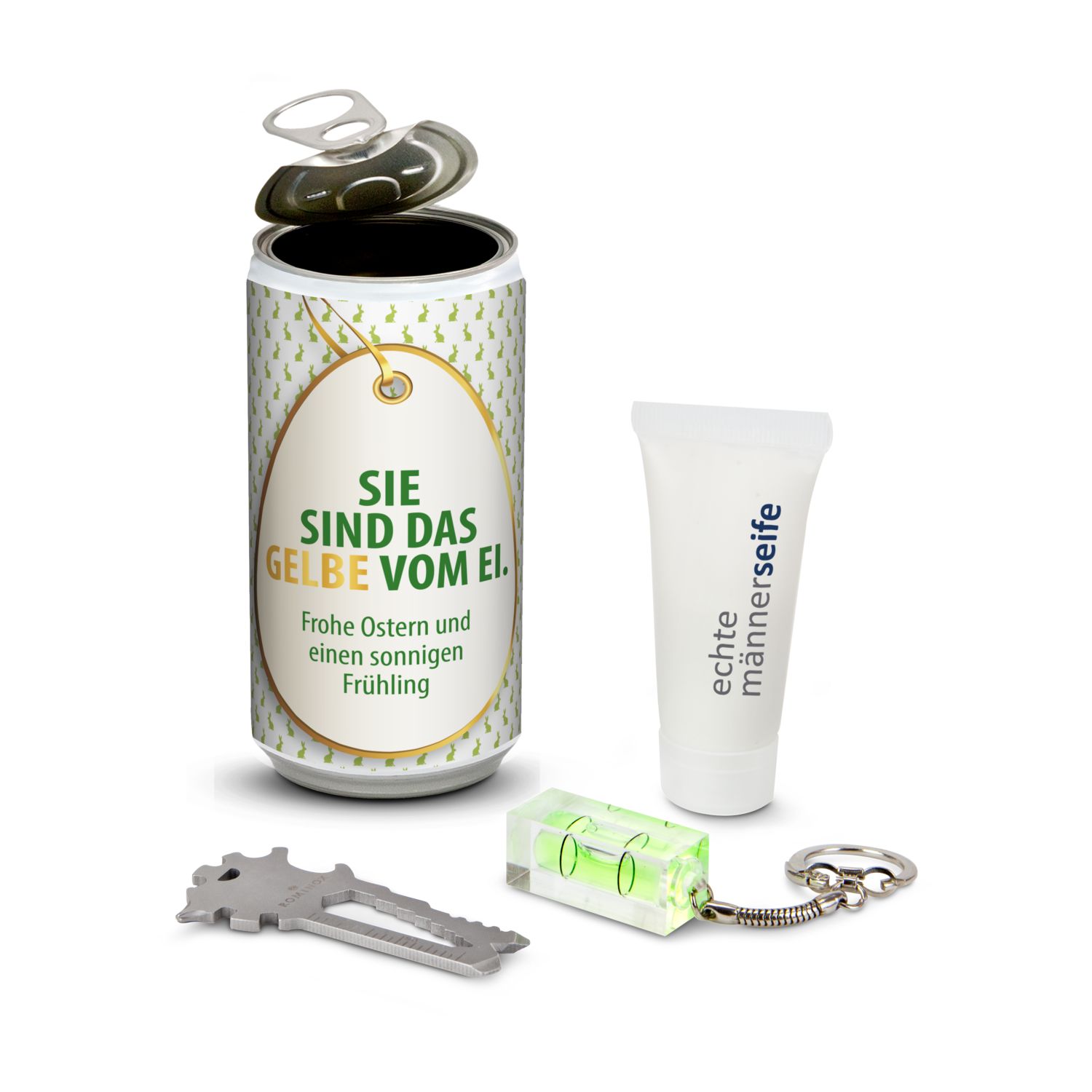 Was nicht passt, wird passend gemacht - eine echte Männerdose! Ob für den Kunden, Kollegen, Mitarbeiter oder Kumpel: mit dieser Dose machen Sie jeden Mann glücklich. Passend für viele Gelegenheiten wie z. B. Ostern. Der Inhalt: ein kreatives ROMINOX® Multitool (sortiert) als Schlüsselanhänger mit 18+ Funktionen und Key Tool Funktionsbeschreibung (verschiedene Designs je nach Verfügbarkeit), eine Mini Wasserwaage und eine 20 ml Tube Duschgel. An die Werkzeuge, fertig, los!