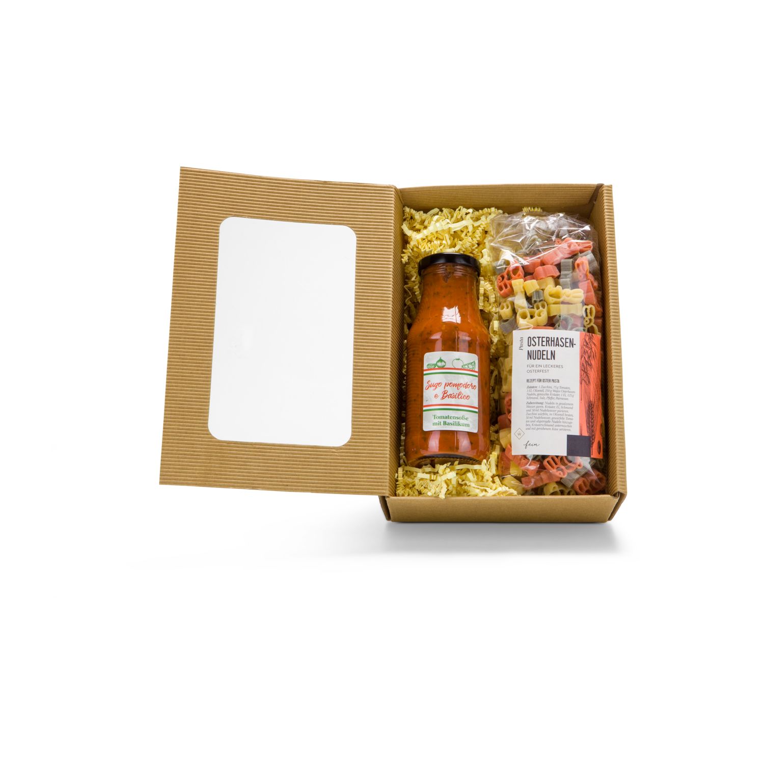 Wer an Ostern genug von all den süßen Naschereien hat, der findet in diesem Set eine gelungene Alternative: fröhliche Osternudeln (250 g) in Osterhasenform kombiniert mit einem Glas fruchtigem Sugo (230 ml). Alles gebettet auf frühlingsgrünem Sizzle und verpackt in einem naturfarbenen Geschenkkarton mit Sichtfenster.