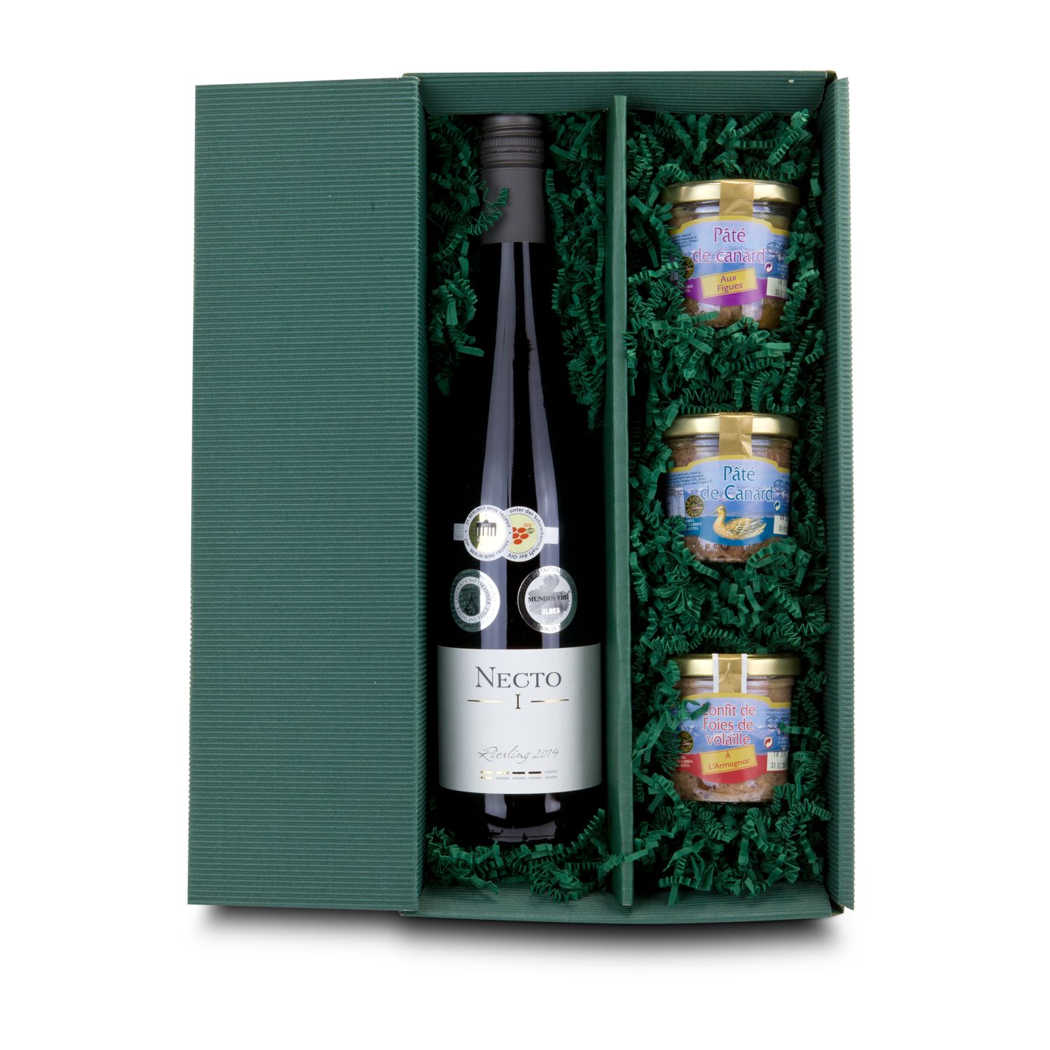 Schmecken Sie den Unterschied! Wir haben mit einem ausgezeichneten, trockenen Riesling Necto I (0,75 l) drei verschiedene Terrinen kombiniert: 1 Terrine de Campagne au Piment d'Espelette, 1 Mousse de Foie de Volaille au Porto und 1 Pâté de Canard (je 90 g). Diese Spezialitäten kommen direkt vom Erzeuger aus Frankreich. Passend verpackt in grüner Schmuckwelle mit Einlage.