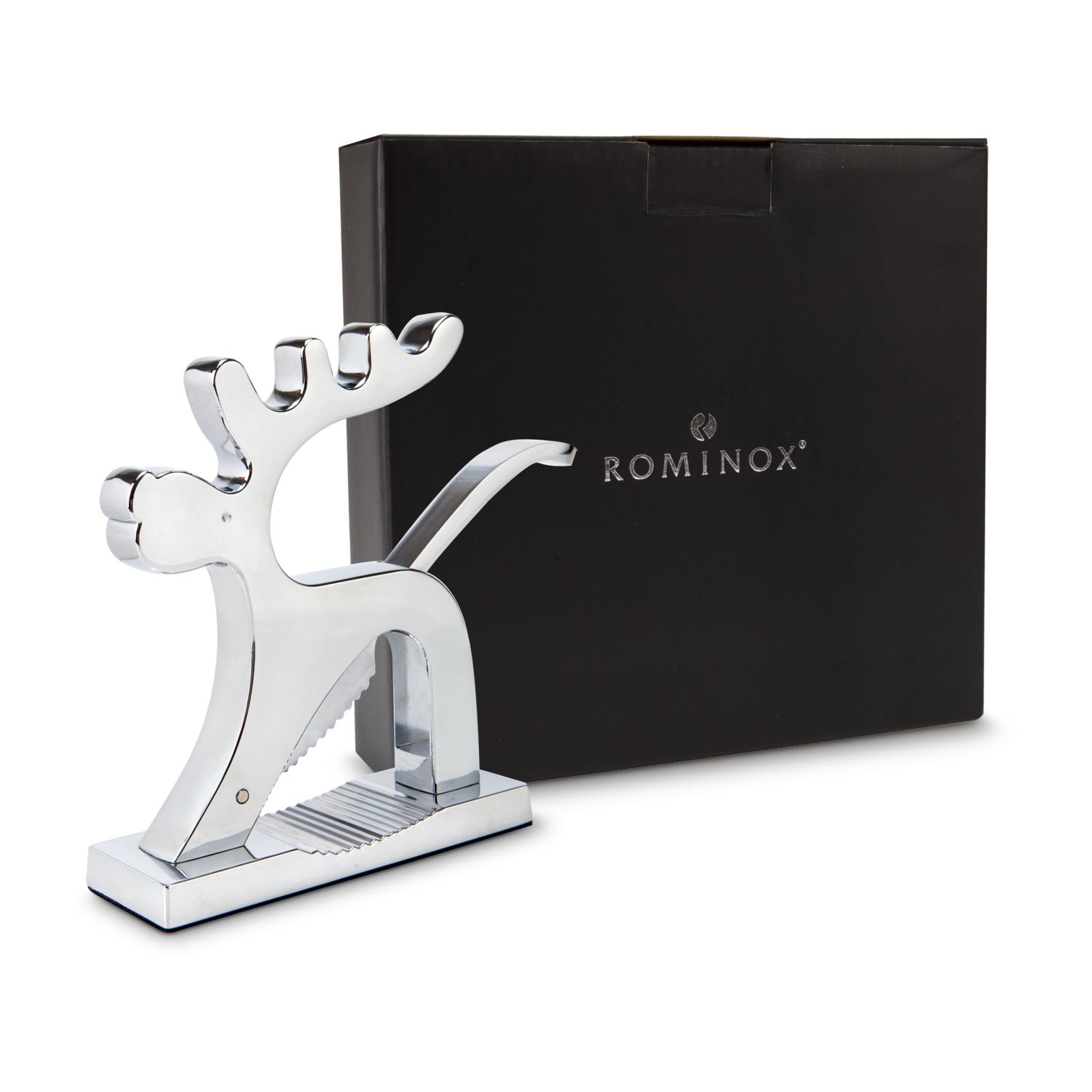Sie können gleich loslegen: Der hochwertige, massive ROMINOX® Rentier-Nussknacker mit Federung liegt in 600 g Walnüssen. Verpackt in schönem schwarzen Sichtfensterkarton.