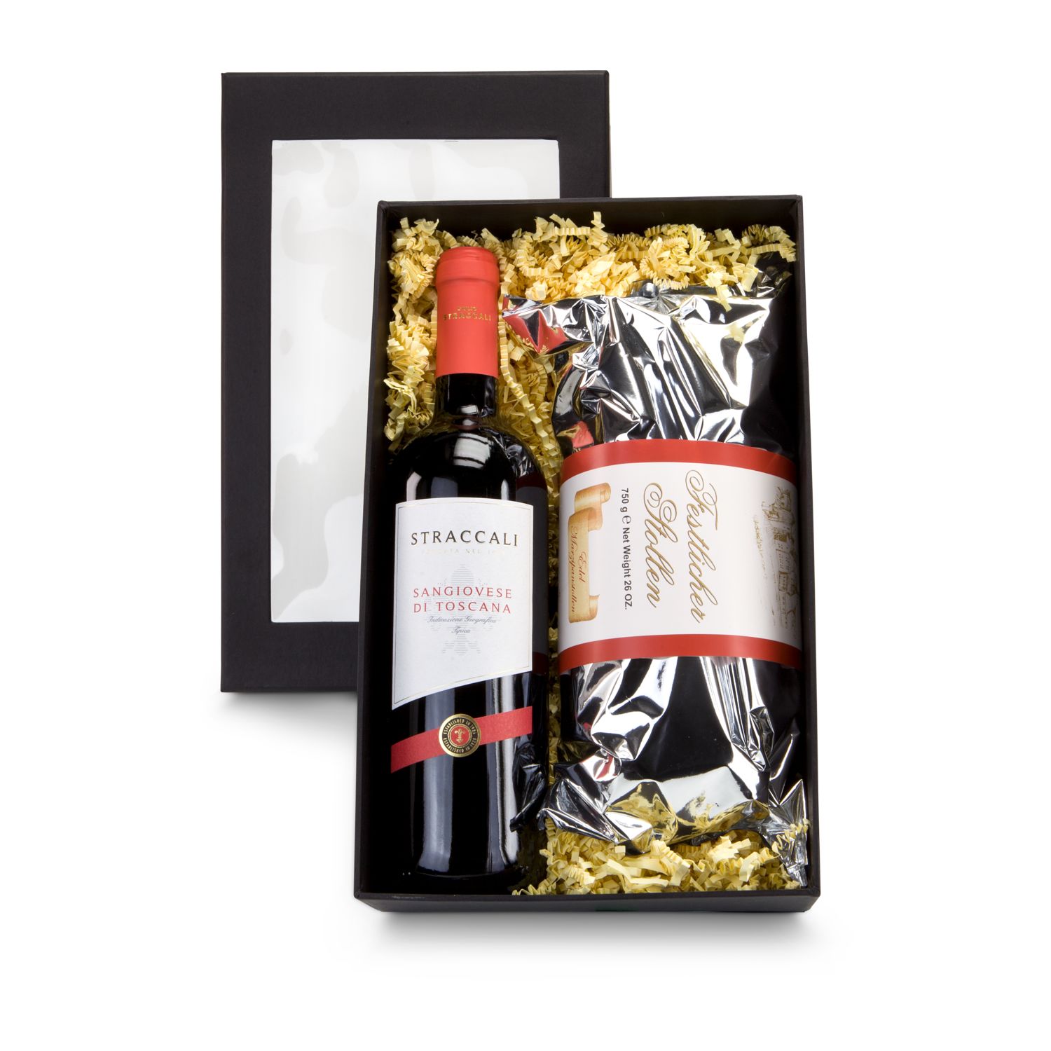 Eine klassische Kombination zur Weihnachtszeit: ein harmonischer, französischer Rotwein Cabernet Sauvignon (0,75 l) und ein leckerer Christstollen (750 g) mit festlicher Banderole. Verpackt ist beides in einem schwarzen Geschenkkarton mit Sichtfenster, ausgefüllt mit Dekomaterial creme. Stimmig und lecker!