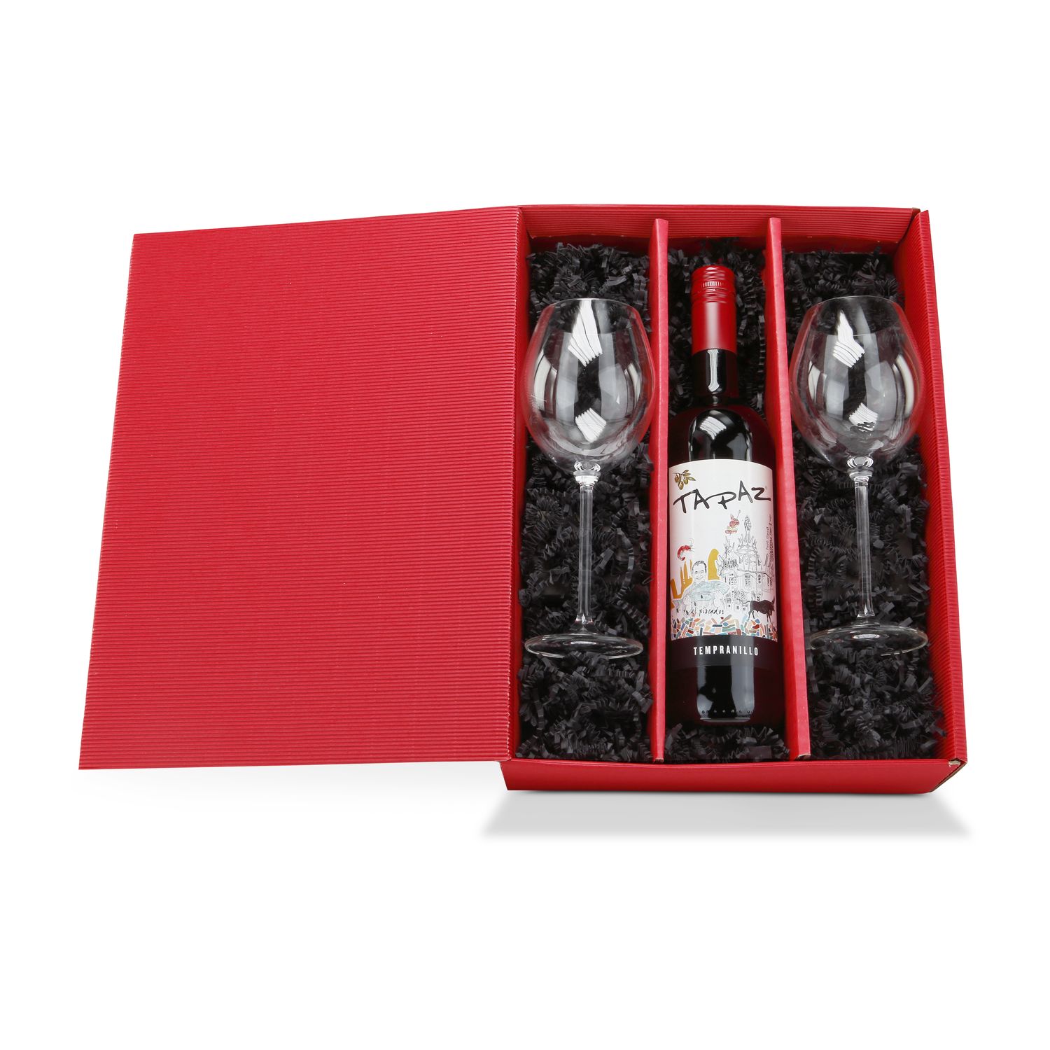Genießen Sie mit diesem exquisiten Geschenkset einen Moment der Entspannung und des Genusses zu zweit. Dieses Set ist perfekt für Weinliebhaber und diejenigen, die Gesellschaft bei einem guten Glas Rotwein schätzen. Das Set enthält eine Flasche Tapaz Tempranillo (0,75 l). Dieser erstklassige spanische Rotwein besticht durch sein volles Aroma und seine ausgewogene Balance. Entdecken Sie die Nuancen von reifen Früchten und die sanften Tannine, die diesen Wein so besonders machen. Damit Sie auch gleich die passenden Gläser zur Hand haben, wird das Set durch zwei elegante Rotweingläser vervollständigt. Diese Gläser sind speziell für die Verkostung von Rotwein entwickelt worden und sorgen dafür, dass Sie das volle Aroma und den Geschmack des Weins ohne Ablenkung genießen können. Das Geschenkset wird in einem roten Geschenkkarton präsentiert und durch schwarzes Dekorationsmaterial stilvoll abgerundet. Cheers!