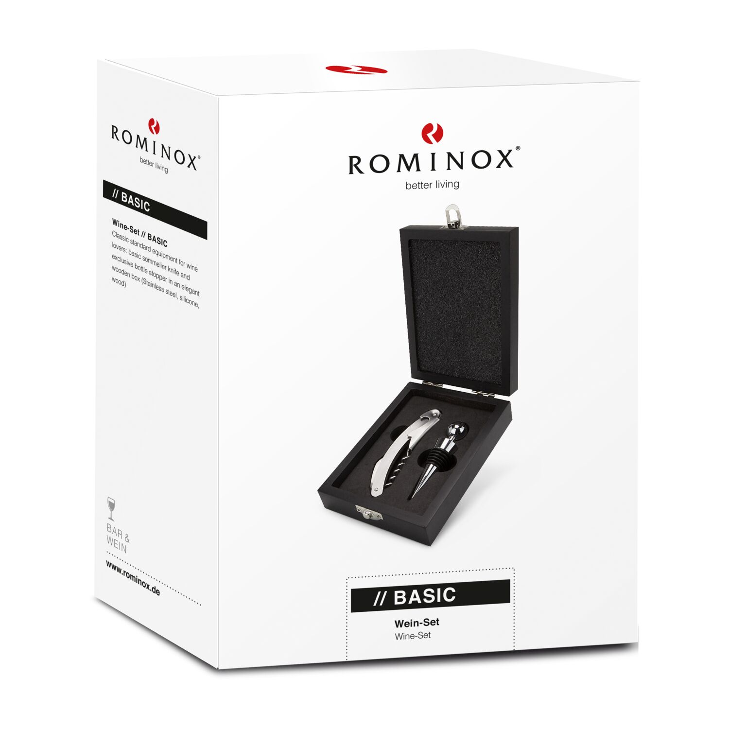 Veredelung: Siebdruck auf dem Produkt (max. 2c), Werbeanbringung auf der Holzbox des Rominox Produkts, max. 10,5 x 14 cm