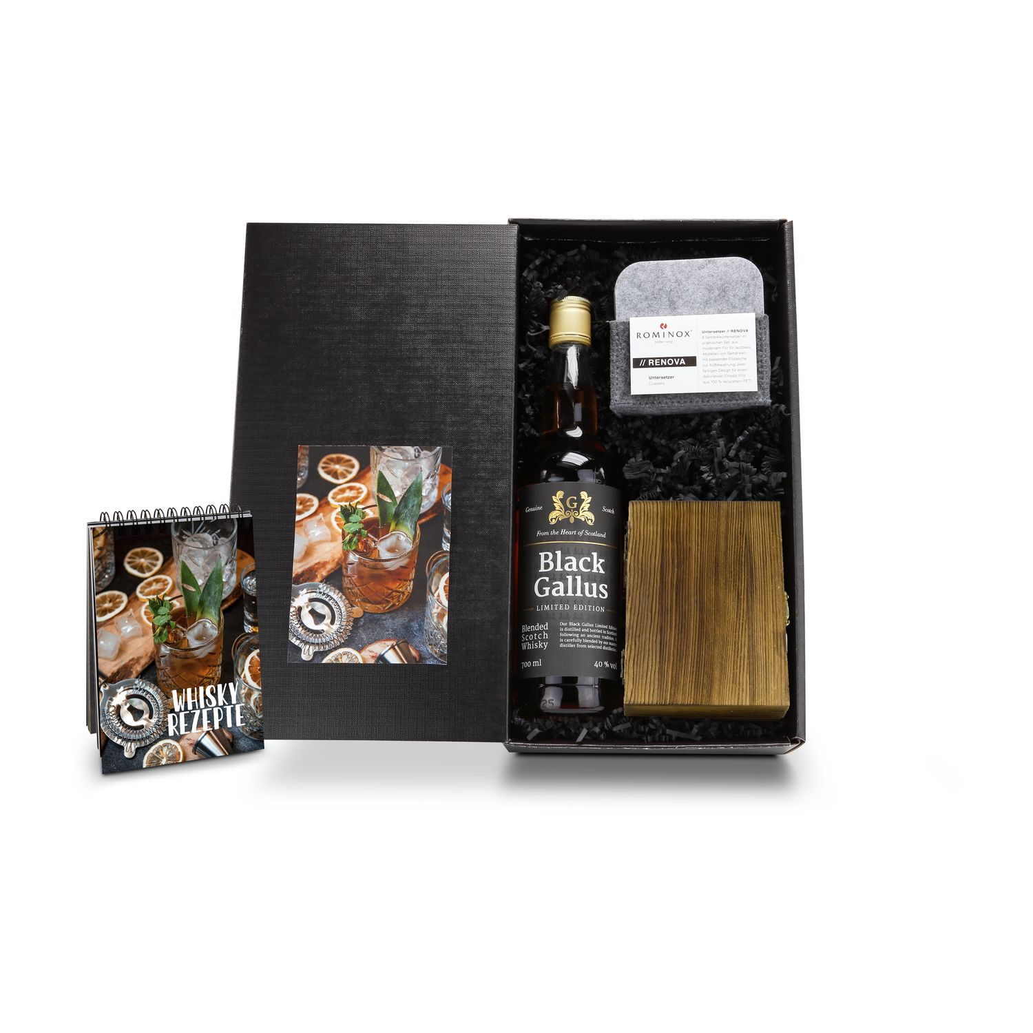 Erleben Sie einen einzigartigen Genussmoment für Whiskyliebhaber. Dieses Set bietet Ihnen alles, was Sie für eine unvergessliche Whiskyerfahrung benötigen: einen exklusiven Scotch, wiederverwendbare Eiswürfel, praktische Untersetzer und inspirierende Rezepte. Geliefert wird eine Flasche Black Gallus Limited Edition Whisky (0,7 l, 40 % Vol.). Dieser Whisky wird im Herzen Schottlands nach alter Tradition destilliert und in limitierter Auflage abgefüllt. Genießen Sie den unverwechselbaren Geschmack dieses Whiskys und tauchen Sie ein in die faszinierende Welt des schottischen Nationalgetränks. Um Ihr Whiskyerlebnis zu perfektionieren, enthält das Set 9 ROMINOX® Whiskysteine aus Granit in einer praktischen Aufbewahrungsbox aus Holz. Diese wiederverwendbaren Eiswürfel ermöglichen es Ihnen, Ihren Whisky auf die perfekte Trinktemperatur zu kühlen, ohne das Getränk zu verwässern. Die Steine werden zusammen mit einer Zange und einem praktischen Beutel für die Gefriertruhe geliefert. Vervollständigt wird das Set durch ein Whisky Rezeptbuch mit 25 verschiedenen Whisky Cocktails und Drinks (kalt und warm) und dem ROMINOX® Untersetzer-Set Renova, bestehend aus 8 modernen Untersetzern aus veganem Filz aus 100% recyceltem PET (zertifiziert nach Global Recycling Standard. Diese zweifarbigen Untersetzer ermöglichen ein lautloses und tropffreies Abstellen Ihrer Whiskygläser und werden zusammen mit einer passenden Filztasche zur Aufbewahrung geliefert. Das Set wird in einem schwarzen Geschenkkarton mit Aufkleber präsentiert. Lassen Sie sich von den raffinierten Rezepten inspirieren und verwöhnen Sie Ihren Gaumen mit neuen Geschmackserlebnissen und tauchen Sie ein in die Welt des Whiskys - worauf warten Sie?