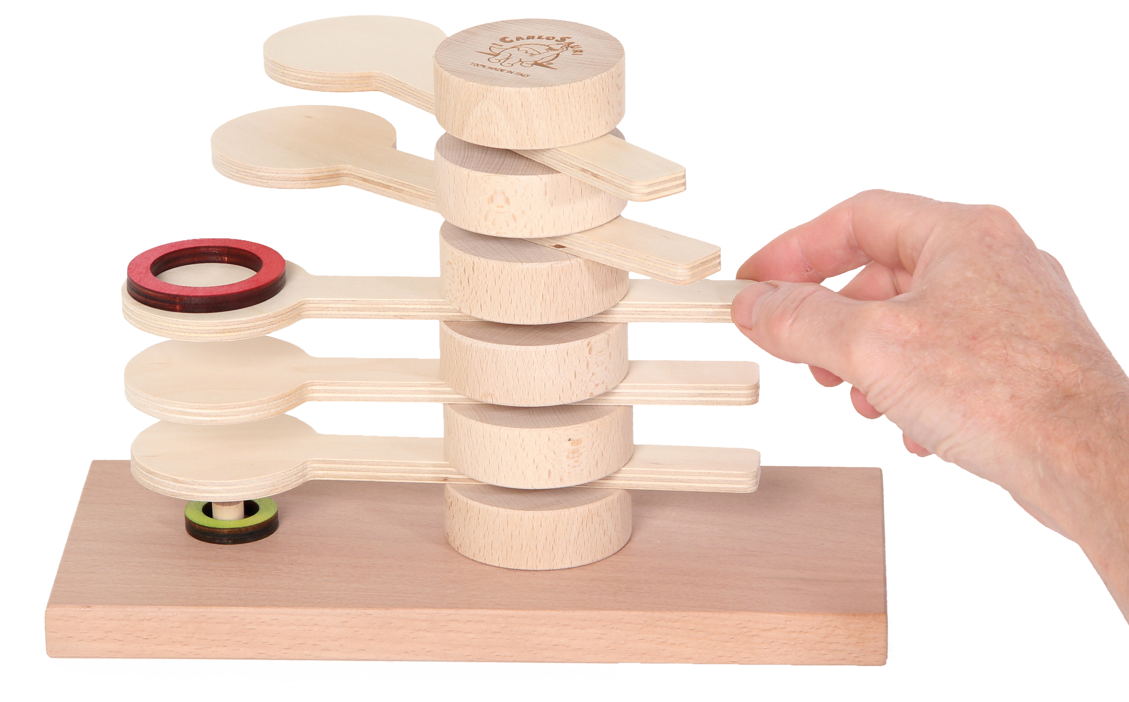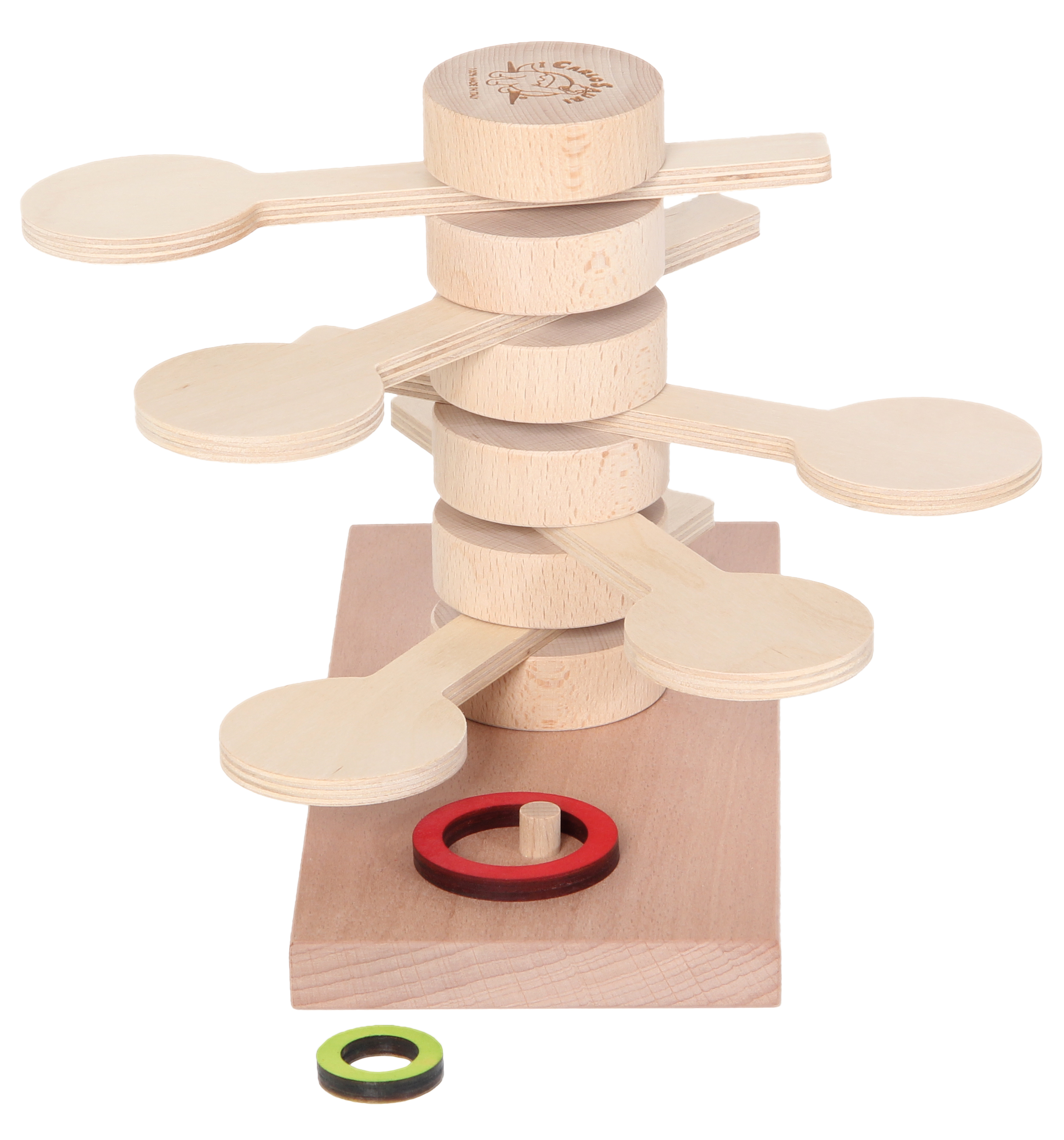 Der große Ring wird auf den obersten Holzlöffel gelegt. Durch einen kräftigen, seitlichen Schlag auf das kurze Ende des Löffels fällt der Ring auf den darunter liegenden Löffel. Solange wiederholen bis der Ring auf der Zielposition landet. Wer das geschafft hat kann das ganze nun mit dem kleineren Ring versuchen! Für einen Spieler. Gefertigt in Italien aus Birken- und Buchenholz.