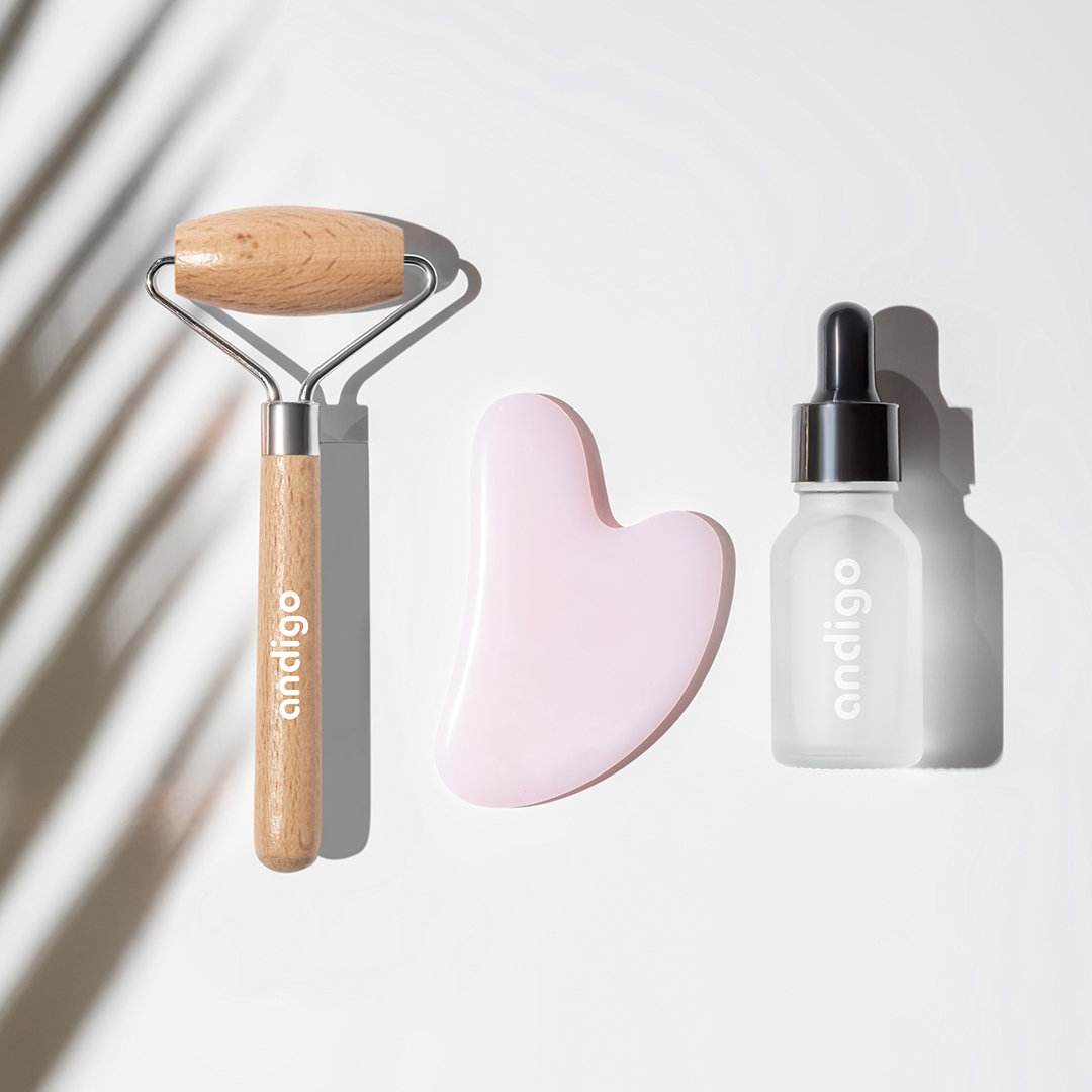 Gesichtsmassage-Massageroller aus Naturholz, der die Gesichtspflege fördert und entspannend wirkt. Präsentiert in einer individuellen Ökodesign-Box aus Kraftkarton.