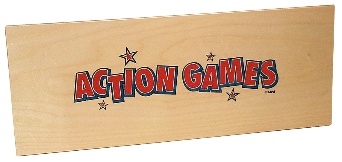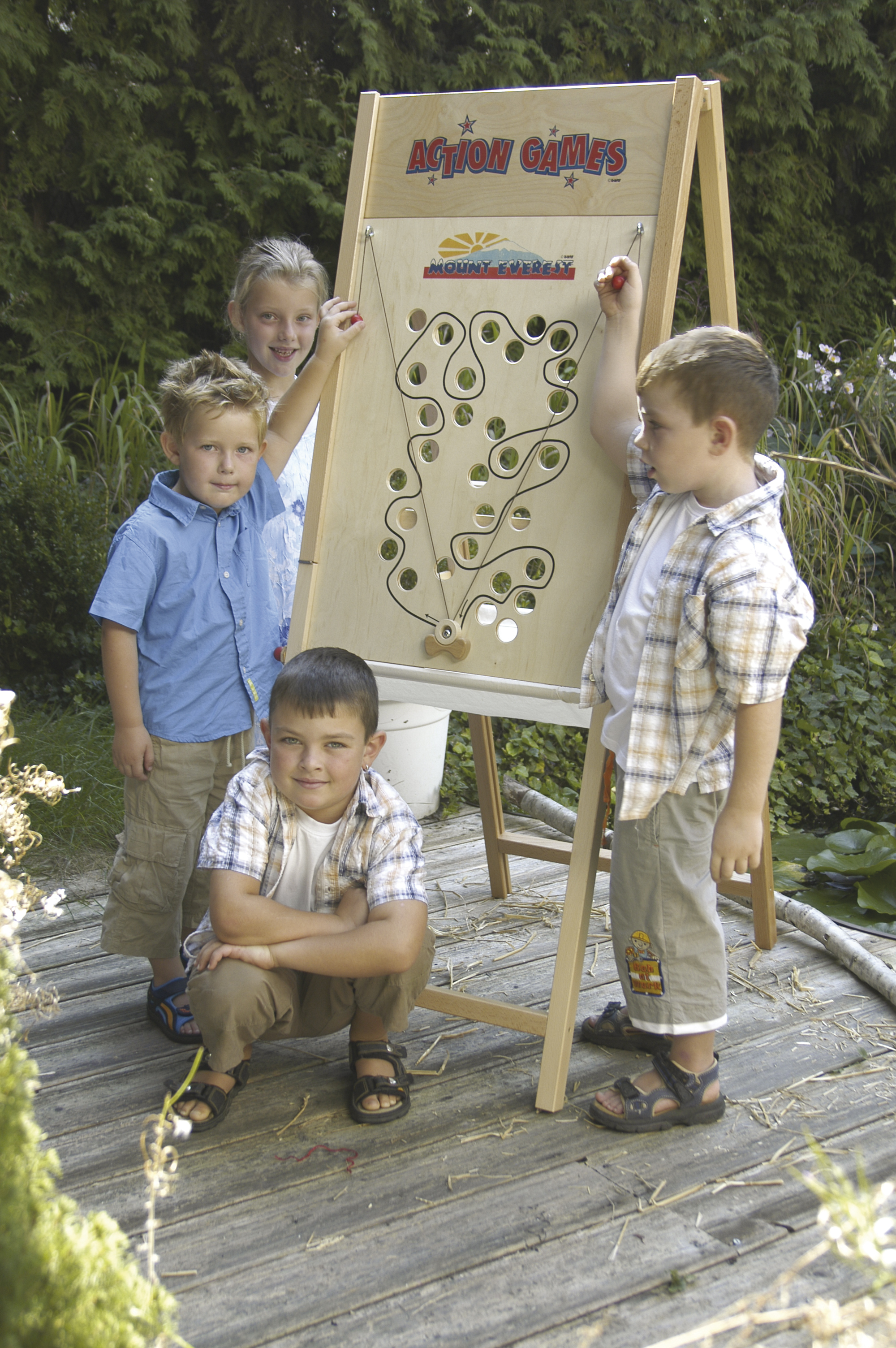 Der Aufsteller für die acht Action-Spieltafeln: Mount Everest, Lotto Lotto, Ringo Bingo, Balla Balla mit 3 Bällen, Fadolino, SOS, Memo, Wurfbude (siehe Art.-Nr. 104899, 104903, 104904, 104902, 105715, 104900, 108390, 108391!). Auf beiden Seiten der stabilen, zusammenklappbaren Staffelei kann man eine Spieltafel einschieben. Eine Stoffbahn in der Mitte verhindert das Herabfallen der Bälle und Kugeln bei SOS, Mount Everest, Balla Balla und Wurfbude. Damit alle die gleichen Trefferchancen haben, können Sie das Action-Games-Brett für kleine Mitspieler über dem Spielbrett, für große Spieler darunter anbringen.