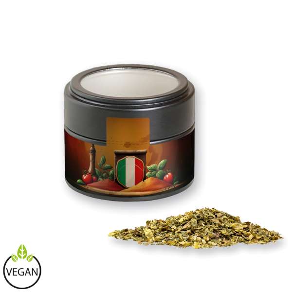 Metalldose Mini mit Sichtfenster schwarz. Werbeanbringung als Etikett in 4c individuell bedruckbar. Zutaten Gewürzmischung Pizza-Kräuter: Oregano, Basilikum, Knoblauch, Zwiebeln, Pfeffer.