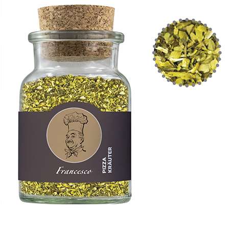 Korkenglas aus Glas mit Papieretikett. Werbeanbringung als Etikett in 4c individuell bedruckbar. Zutaten Gewürzmischung Pizza-Kräuter: Oregano, Basilikum, Knoblauch, Zwiebeln, Pfeffer.