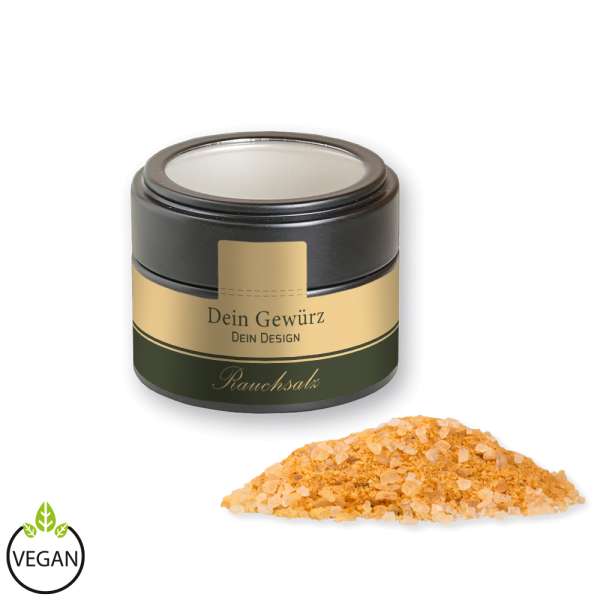 Metalldose Mini mit Sichtfenster schwarz. Werbeanbringung als Etikett in 4c individuell bedruckbar. Zutaten Gewürzmischung Rauch-Salz grob: Salz, Rauch, Paprika, Trennmittel: Siliciumdioxid E 551