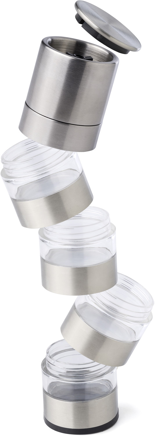 Gewürzmühle aus Edelstahl mit 4 Fächern und Keramikmahlwerk. Einzeln verpackt in einer braunen Kartonbox.