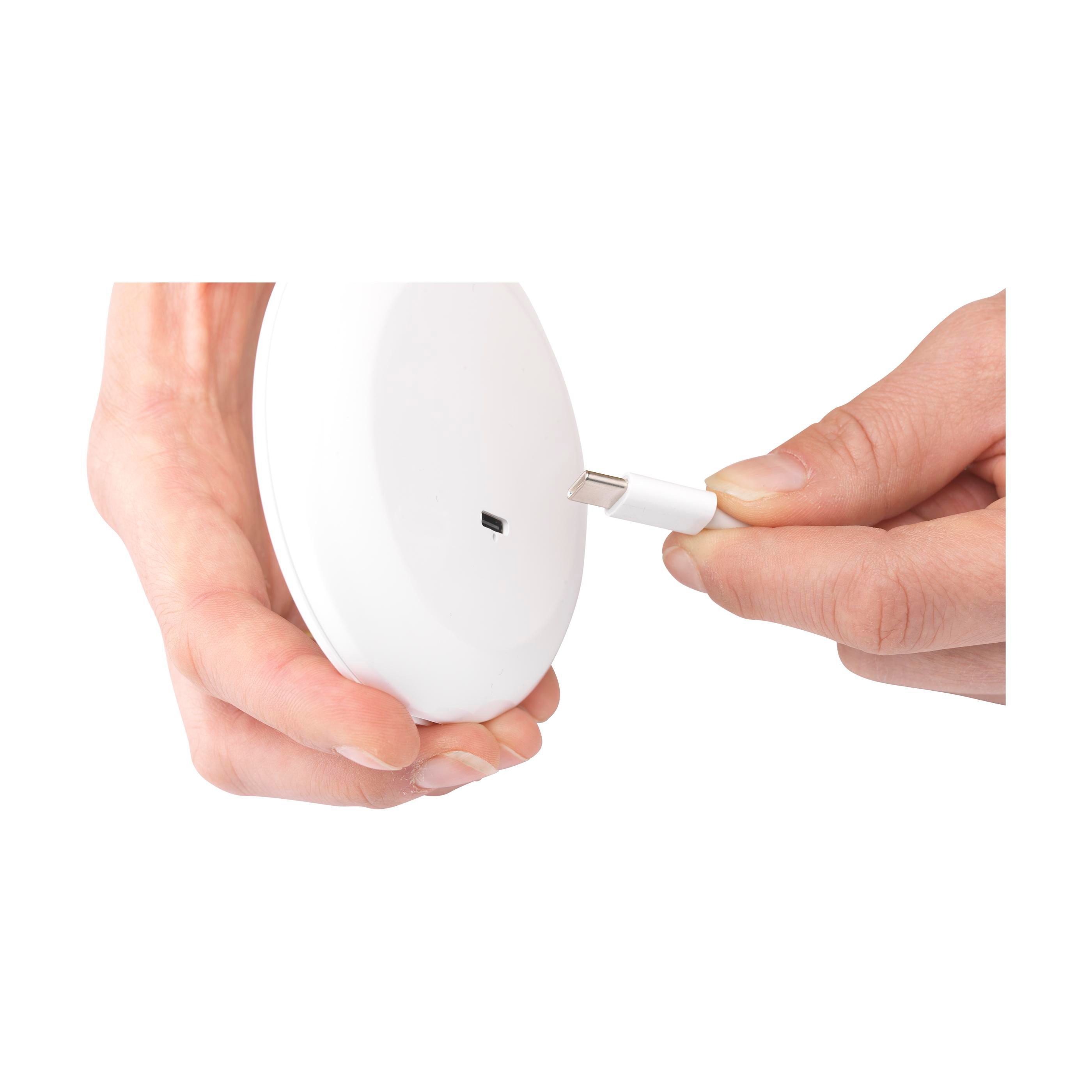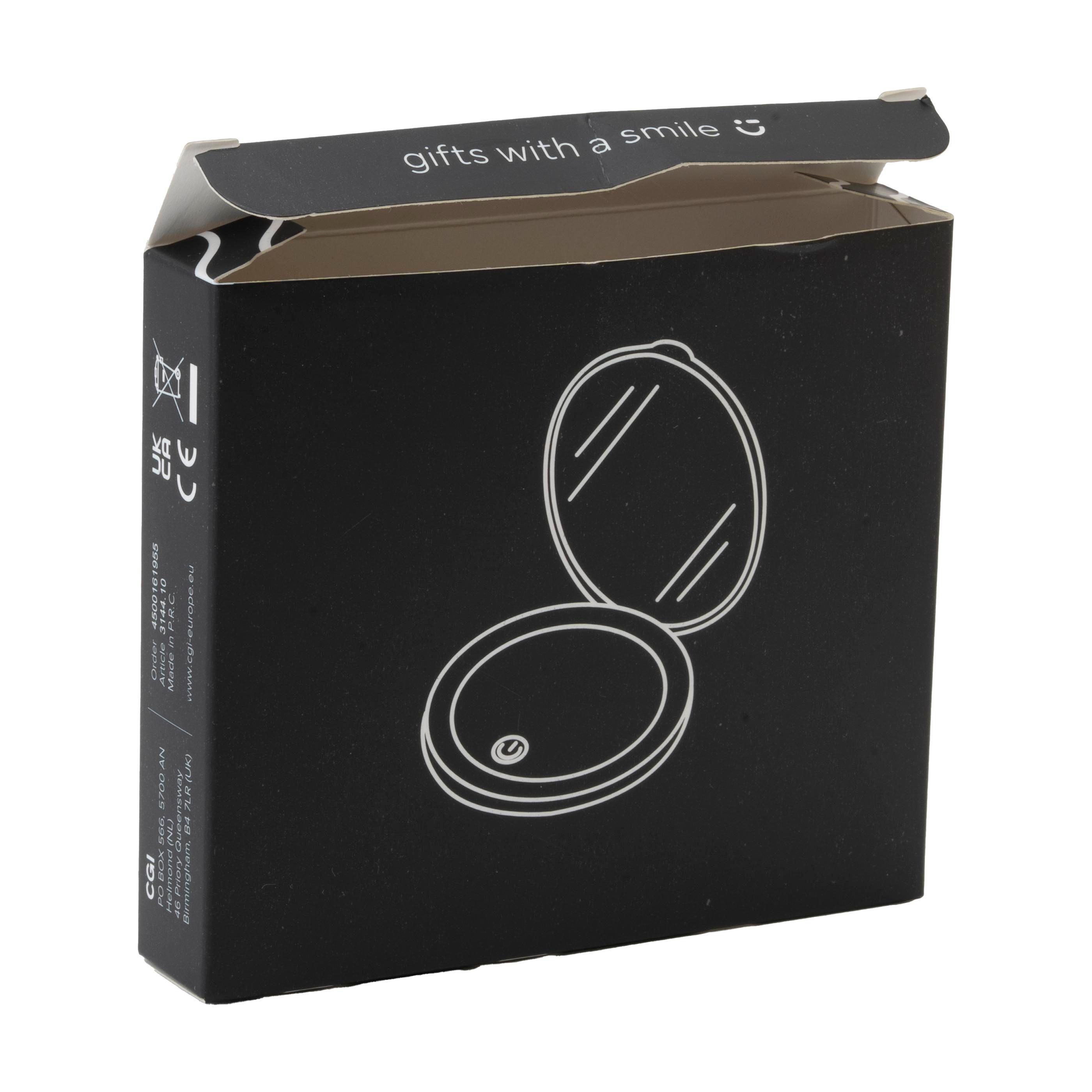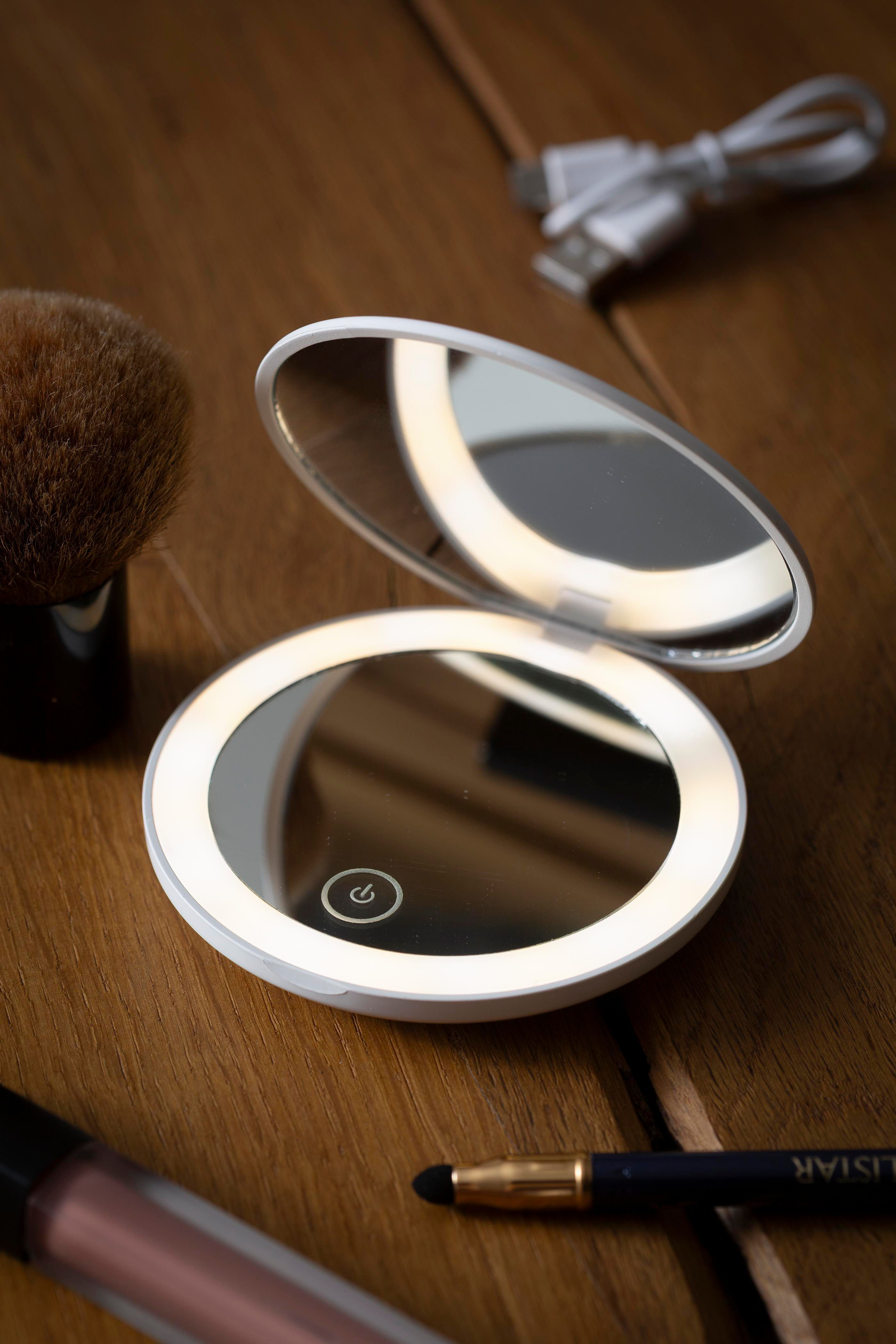 Kompakter, runder Make-up-Spiegel (Ø 8,3 cm) aus ABS mit zwei Glasspiegeln, davon einer im Deckel. Bietet klare Sicht dank der integrierten Touch-LED-Beleuchtung in drei Lichtstufen. Kompakt, elegant und ein unverzichtbares Accessoire in jeder Handtasche. Mit Magnetverschluss und Kontrollleuchte. 5 V/3 W. Über den USB-C-Anschluss lässt sich der Spiegel einfach aufladen. Ladezeit ca. 20 Minuten für eine Betriebsdauer von 5-8 Stunden. Inklusive wiederaufladbarem 100-mA-Lithium-Ionen-Polymer-Akku, USB-C-zu-USB-C-Ladekabel und Gebrauchsanweisung.