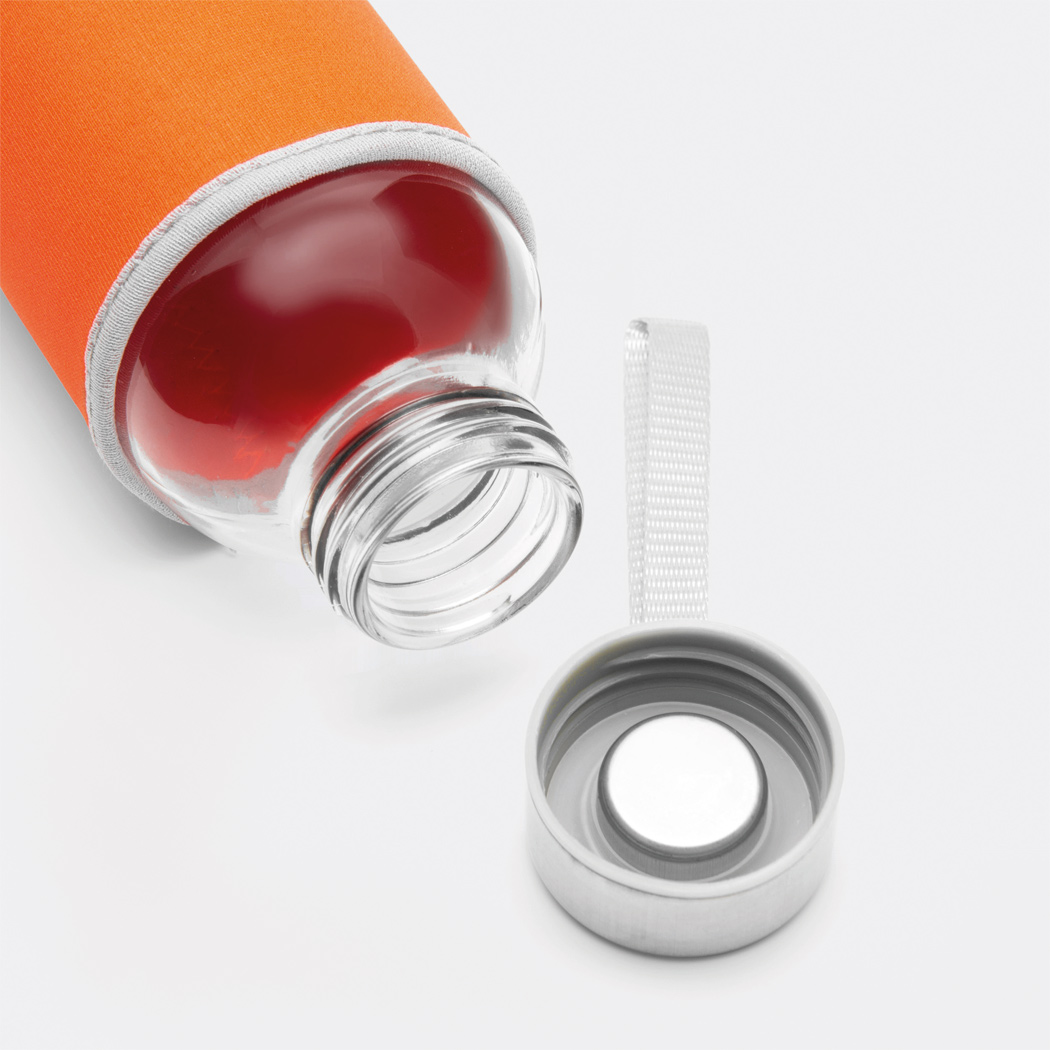 Glas-Trinkflasche TAKE WELL: Edelstahldeckel mit Schraubverschluss, Silikon-Dichtring und Handschlaufe, inkl. farbiger Schutzhülle, Füllmenge ca. 450 ml, in Box
