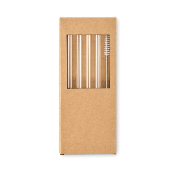 Set mit 4 wiederverwendbaren Trinkhalmen aus Borosilikatglas und Reinigungsbürste. Lieferung in Pappschachtel.