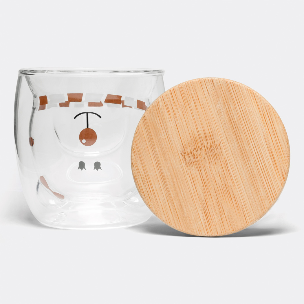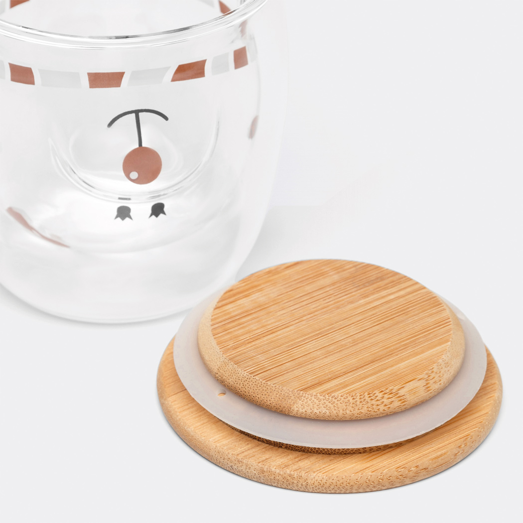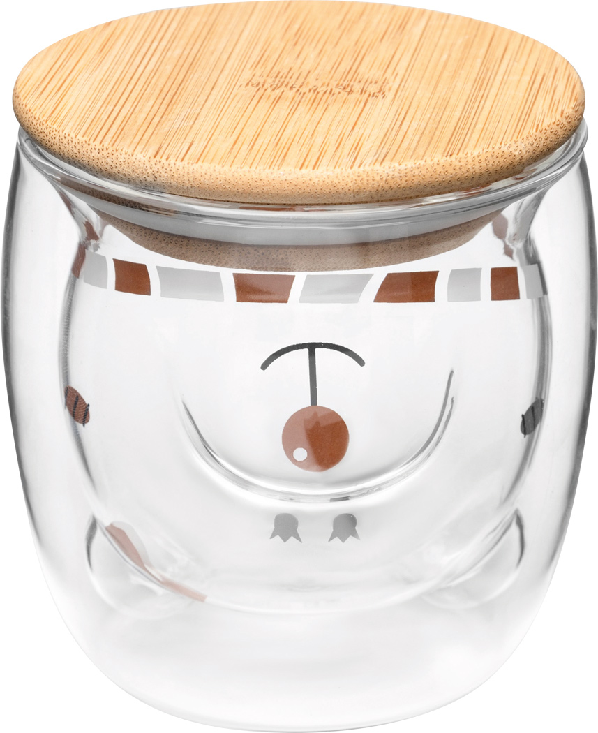 Glas XMAS BEAR, doppelwandig: Bambusdeckel mit Silikon-Dichtring, transparent, temperaturbeständig, Bärengesichtsform mit brauner Nase und Schal, Füllmenge ca. 250 ml, in Box