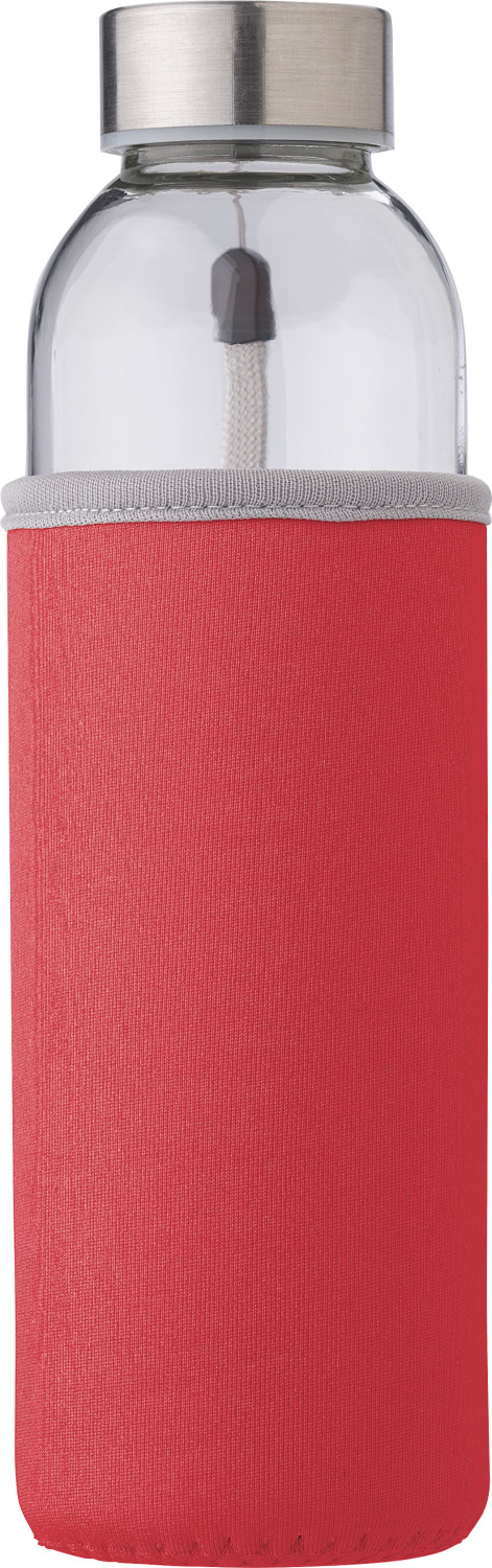 Trinkflasche (ca. 500ml) aus Glas mit Neopren-Schutzhülle. Nur für kalte Getränke geeignet.