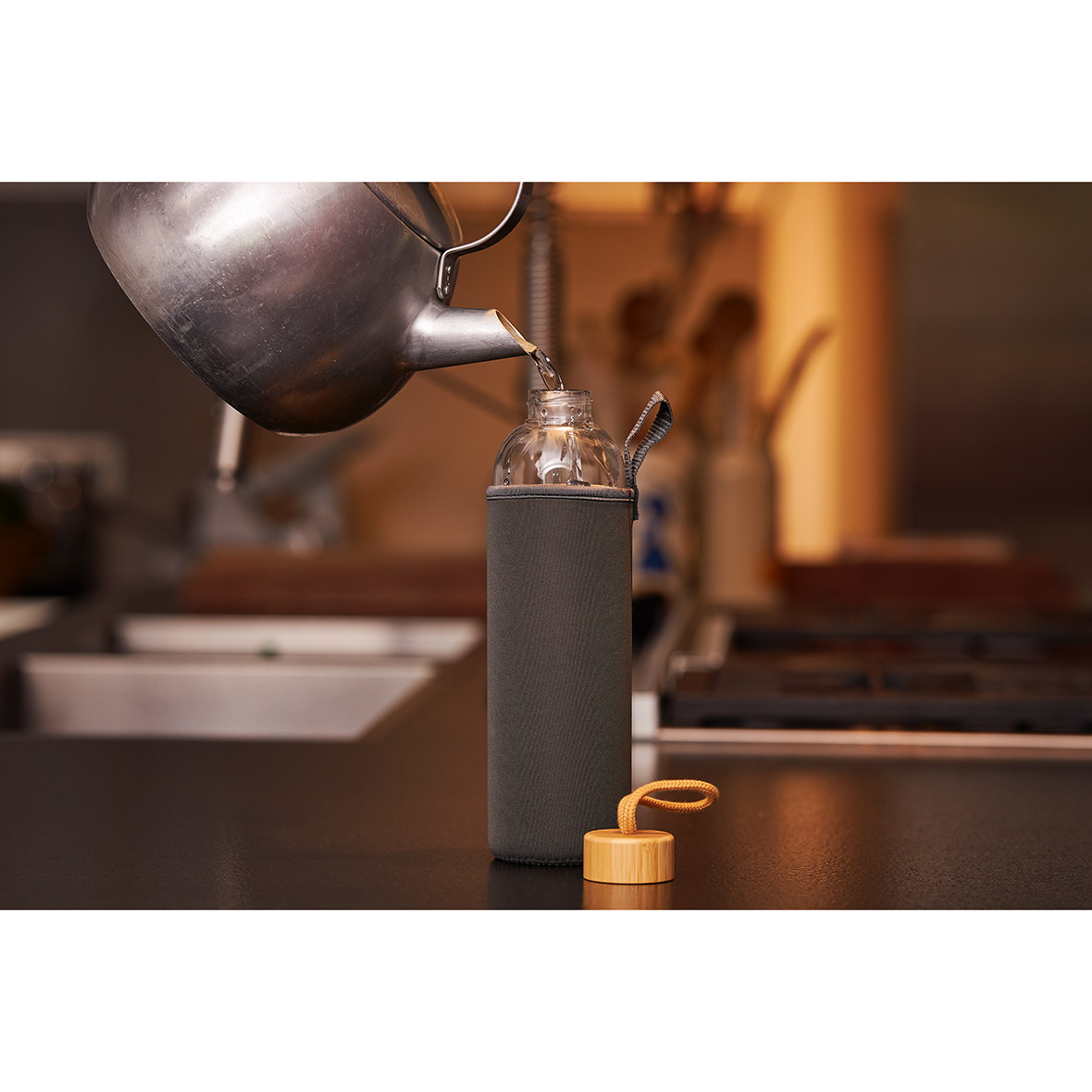 Flasche aus Borosilikat-Glas mit Schraubverschluss aus Bambus-Holz inkl. Silikondichtung. Die griffige, graue Synthesekautschukhülle mit Halteschlaufe hält die Temperatur der Getränke länger konstant. Zudem schützt sie die Hände bei heißen Getränken vor dem warmen Glas. Füllmenge: 1,0 Liter. Größenschwankung zwischen 28,5cm - 29,5cm möglich.