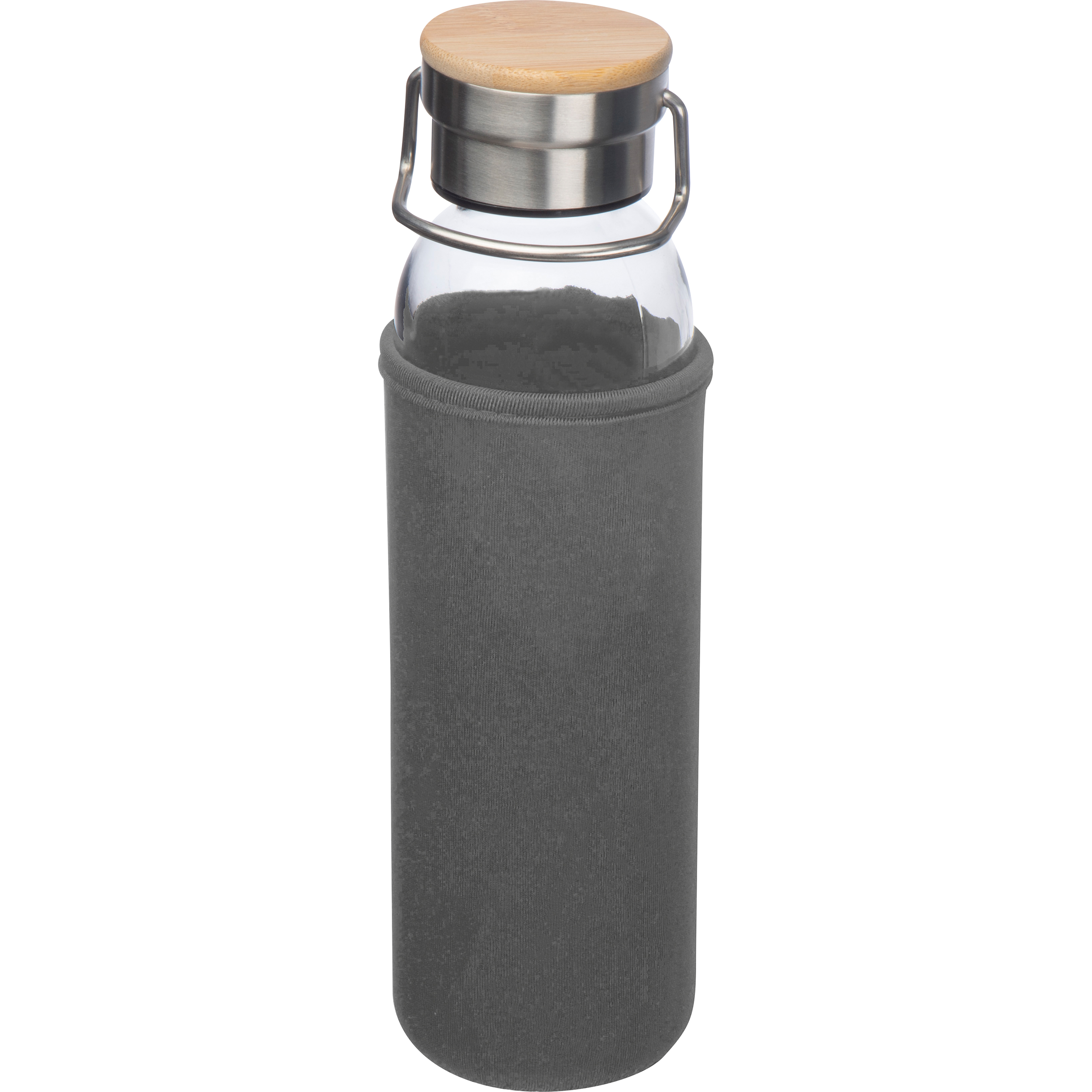 Trinkflasche aus Glas mit Neoprenüberzug, Edelstahldeckel mit Bambusoberteil, Tragehenkel und einem Füllvermögen von 600ml. Ihre Werbung wird auf den Überzug gedruckt.