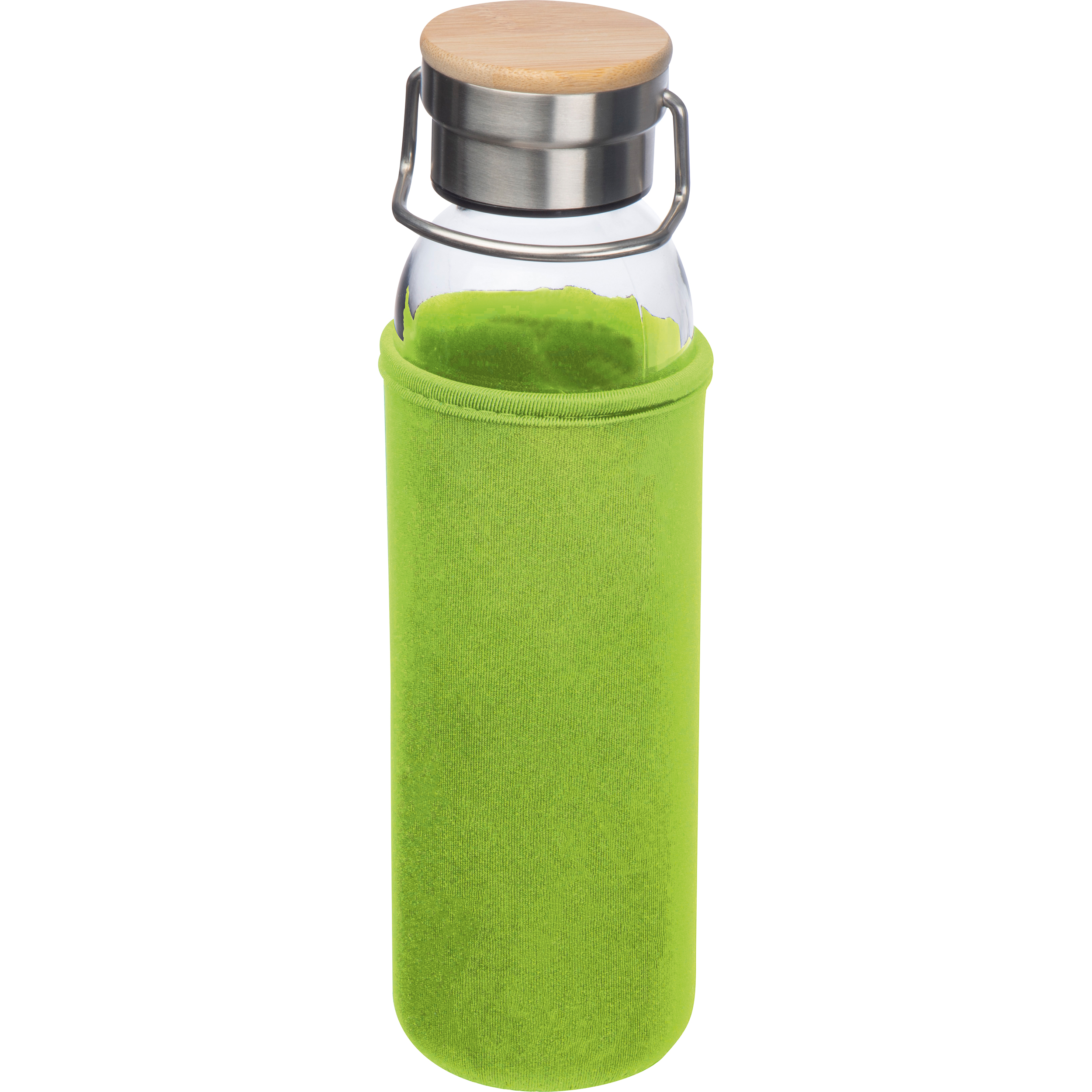 Trinkflasche aus Glas mit Neoprenüberzug, Edelstahldeckel mit Bambusoberteil, Tragehenkel und einem Füllvermögen von 600ml. Ihre Werbung wird auf den Überzug gedruckt.