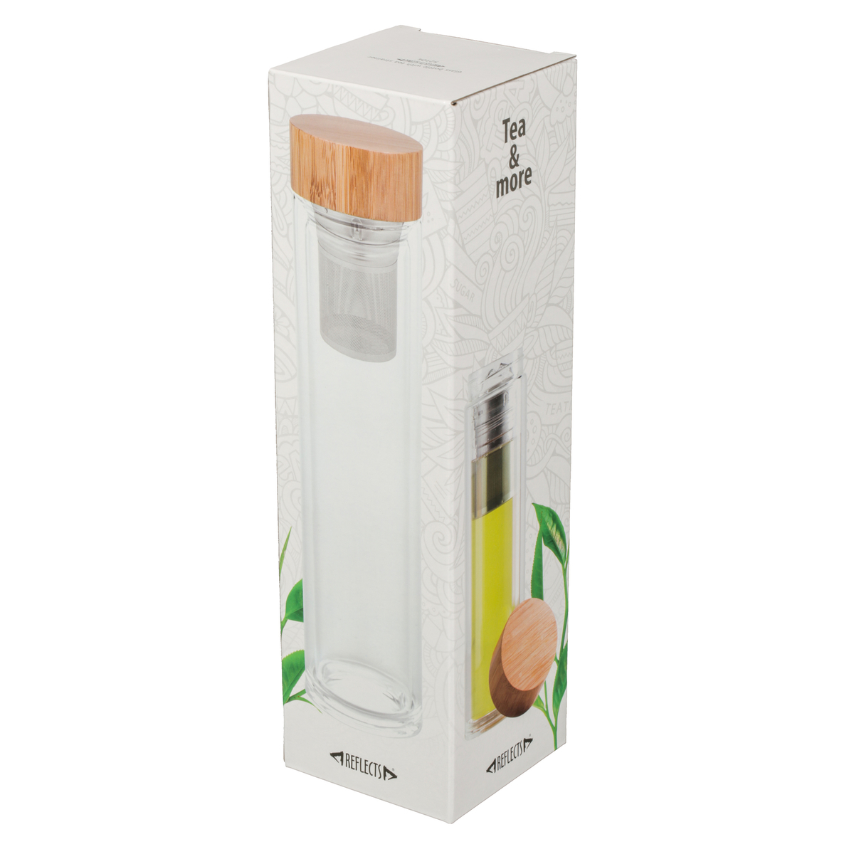 Die stylische Glasflasche REFLECTS-SLEDGE macht Tee zum neuen Szenegetränk. Die lange schlanke Glasflasche mit Teesieb (261 x 73 x 73 mm) mit hochwertigem Bambusverschluss und integriertem Edelstahlsieb ist an Stilsicherheit kaum zu überbieten. Doch nicht nur auf der Küchenzeile macht sich die schicke Teeflasche ausgesprochen gut. Auch unterwegs wird die skandinavisch angehauchte Flasche Bewunderung auf sich ziehen. Diese stabile Glasflasche mit Teesieb macht Teatime immer und überall zum Vergnügen. Dank des herausnehmbaren Siebes können Sie Aroma und Stärke des Tees individuell bestimmen - ganz nach Ihren eigenen Vorlieben. Geben Sie den Tee direkt in die Teeflasche oder in das Teesieb. Die Menge ist abhängig von der Teesorte und der gewünschten Stärke. Wir empfehlen zwei bis acht Gramm. Füllen Sie das heiße Wasser direkt in die Teeflasche und schließen Sie den Deckel. Lassen Sie den Tee eine bis fünf Minuten (je nach Sorte und persönlicher Vorliebe) in der Flasche ziehen. Je nach Sorte kann der Tee bis zu vier Mal aufgegossen werden. Entfernen Sie nach der gewünschten Ziehzeit einfach das bewegliche Edelstahlsieb aus der Glasflasche und genießen Sie bis zu 500 ml leckeres Teearoma!Vorsicht: Der Tee bleibt in der Flasche sehr lange heiß!Wenn Werbung durch den Magen geht:Eine Glasflasche mit Teesieb kann jeder. Eine individualisierte Glasflasche mit Teesieb aber können nur die wenigsten. Ob mit feiner Lasergravur oder mit haltbarem Tampondruck - wir wollen, dass Ihre Glasflasche mit Teesieb in Erinnerung bleibt.