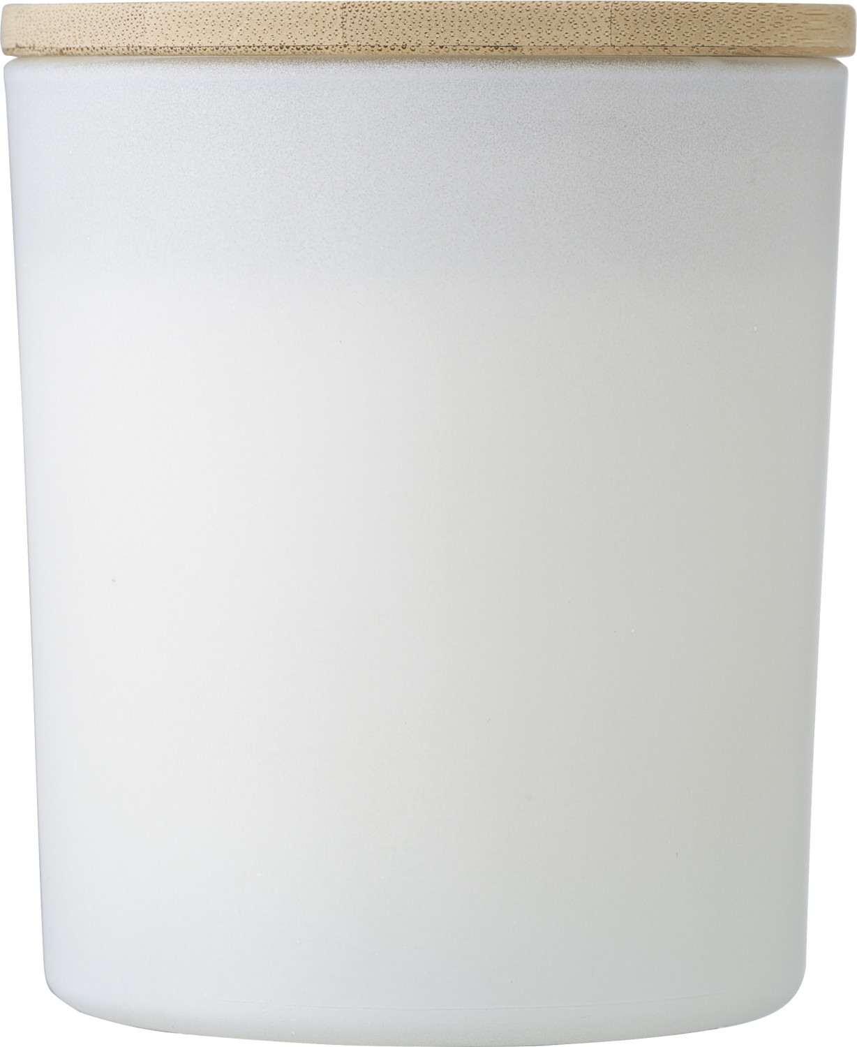 Glaskerze mit pflanzlichem Wachs und einem Deckel aus Bambus. Die Kerze enthält hauptsächlich Wachs auf pflanzlicher Basis (Carnaubawachs) und hat eine Brenndauer von ca. 46 Stunden. Vier Düfte je nach Glasfarbe: Zimt (rot), Vanille (weiß), Sandelholz (schwarz) und Jasmin (grün). Einzeln verpackt in einer weißen Verpackung. Größe Kerze: Durchmesser 9cm / Höhe 10,5cm