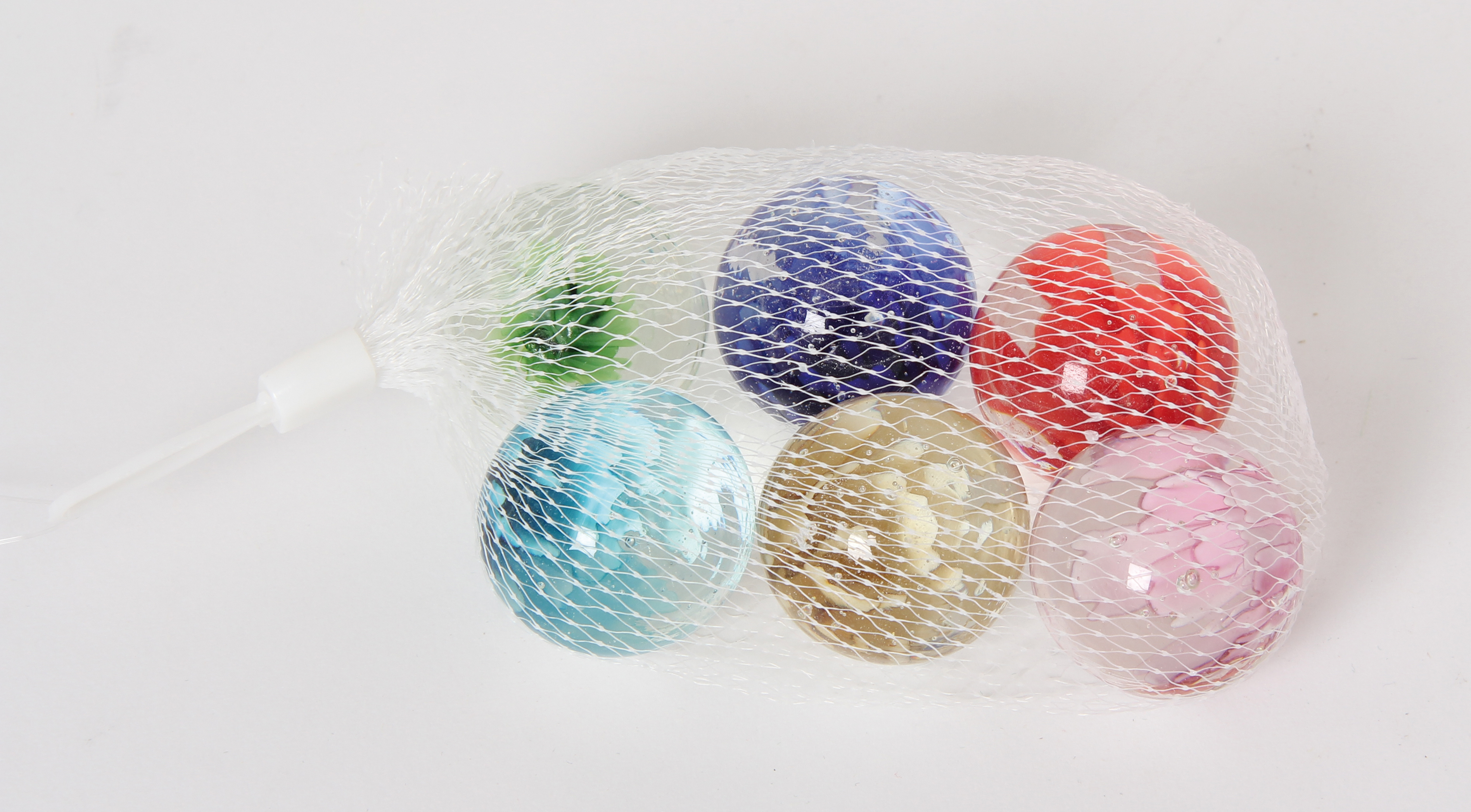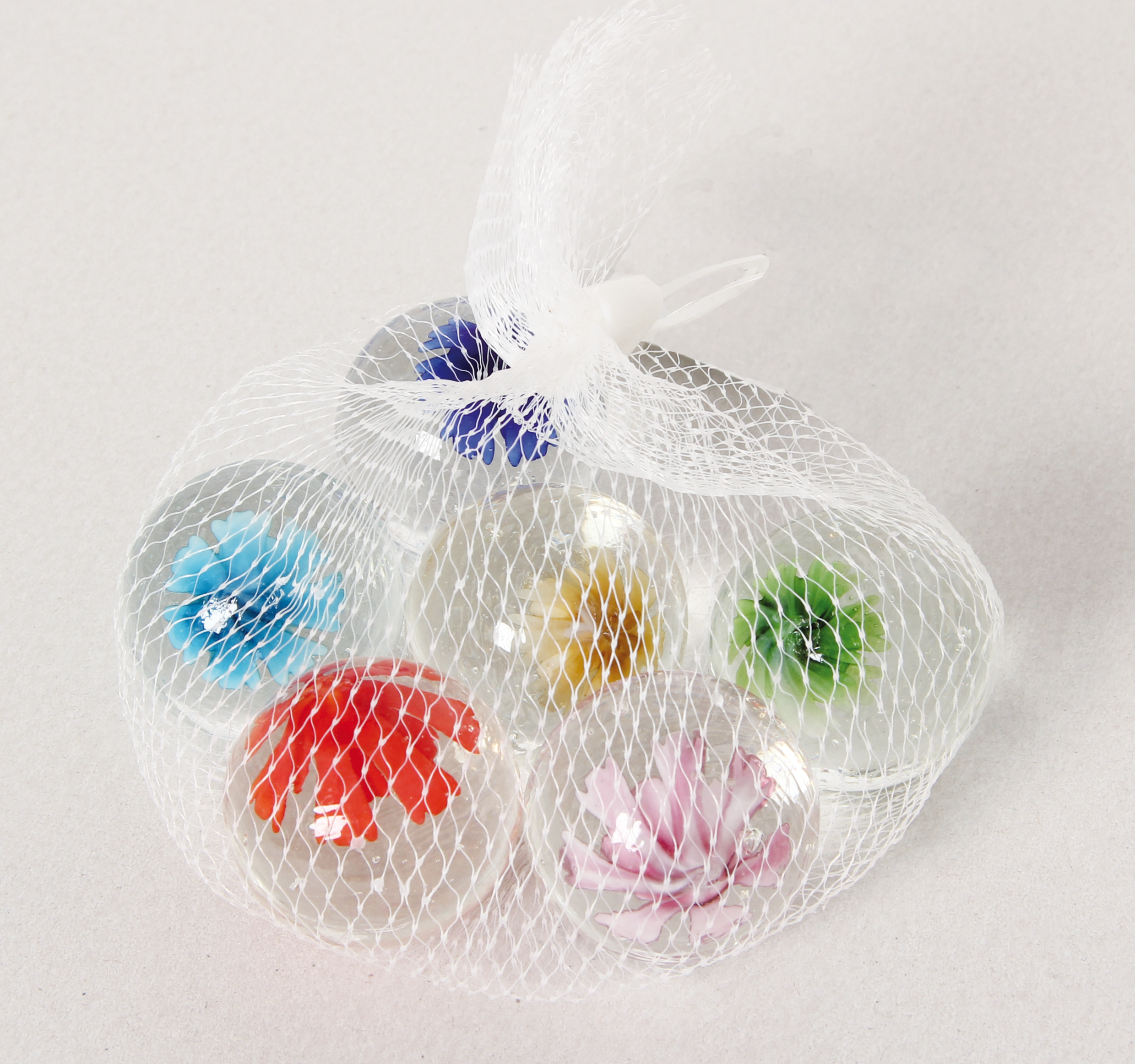 Handwerklich sehr aufwändig hergestellte Murmeln. Da man wegen der Hitze von geschmolzenem Glas keine echten" Blüten einschließen kann, die würden nämlich sofort verbrennen, müssen die Blüten erst aus Glas nachgebildet werden. 6 verschiedene Farben im Set. "