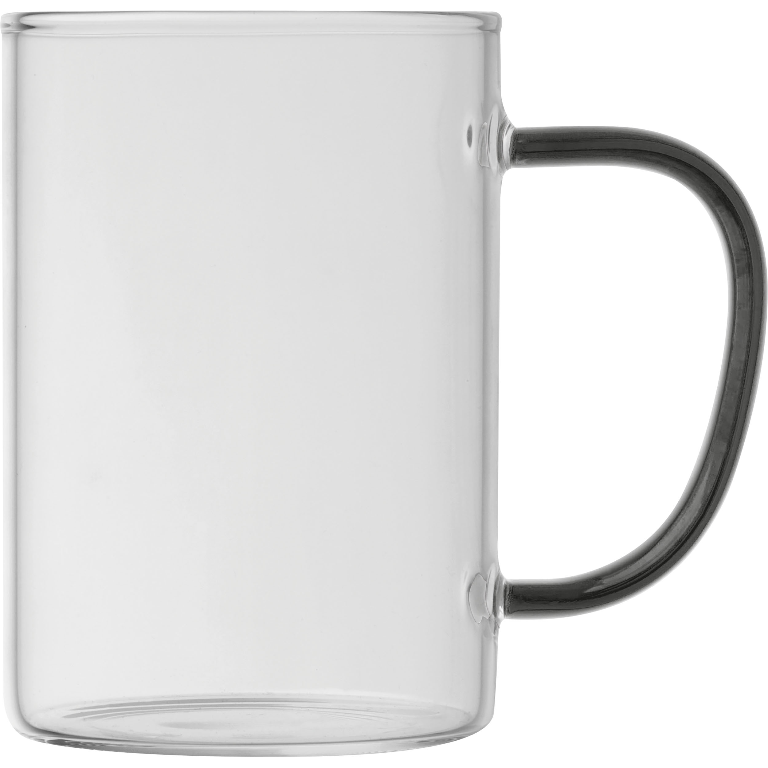 Tasse aus Glas mit einem farblich abgesetzem Henkel und einem Fassungsvermögen von 250ml. Ihre Werbung wird auf die Tasse gedruckt.