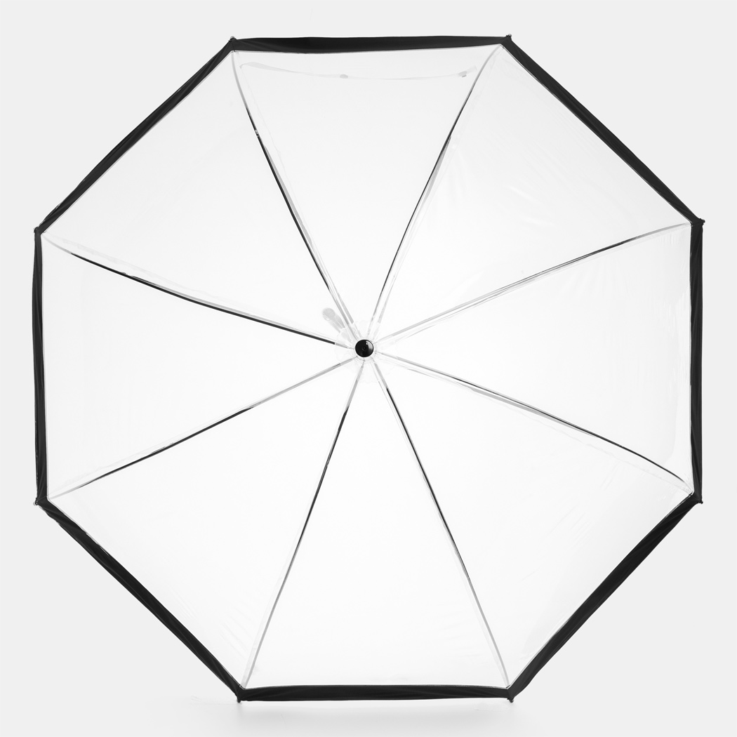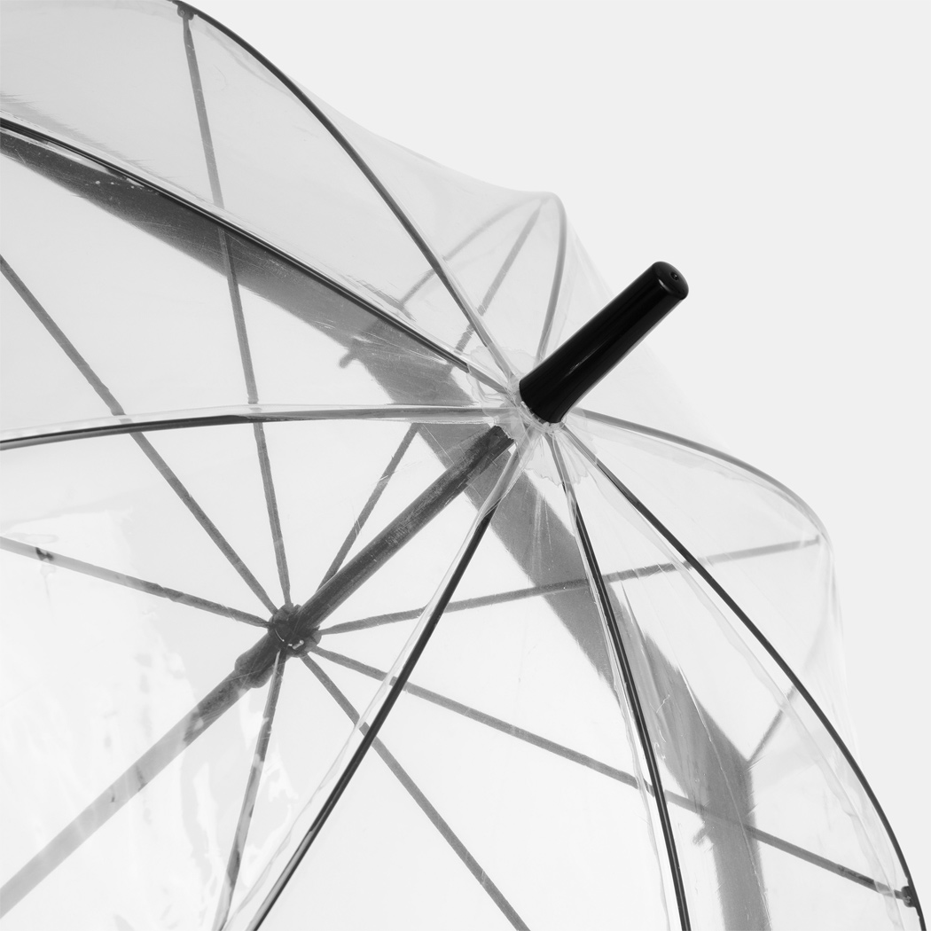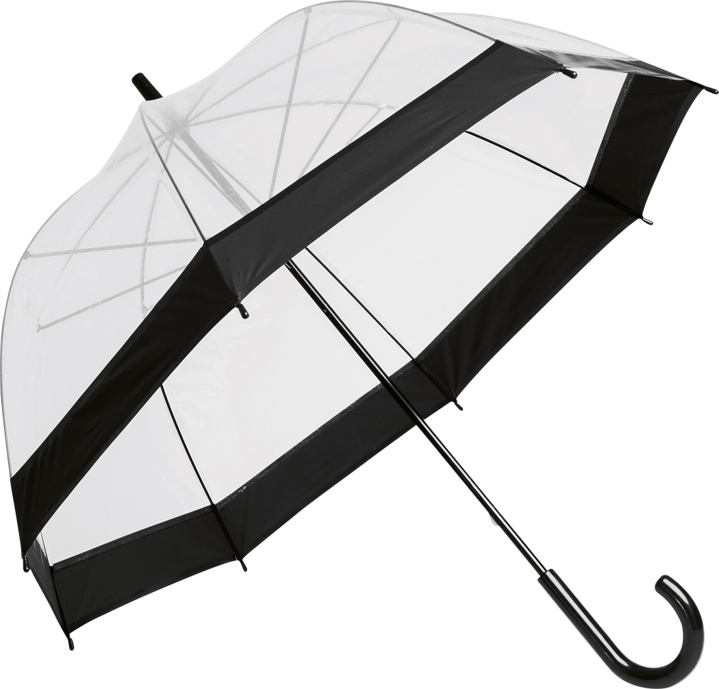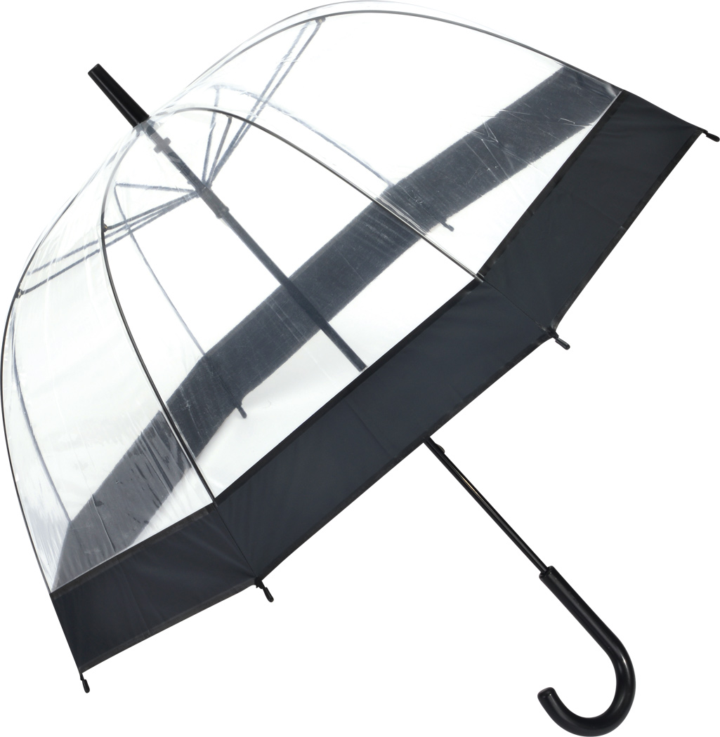 Glockenschirm HONEYMOON: Metallstock und –speichen, Kunststofftips und –spitze, Kunststoffrundhakengriff, transparente POE-Bespannung mit farbiger Bordüre, Schließband mit Druckknopf