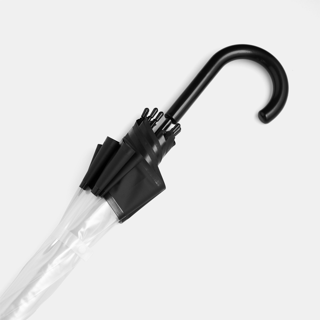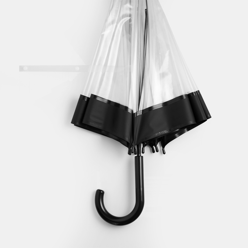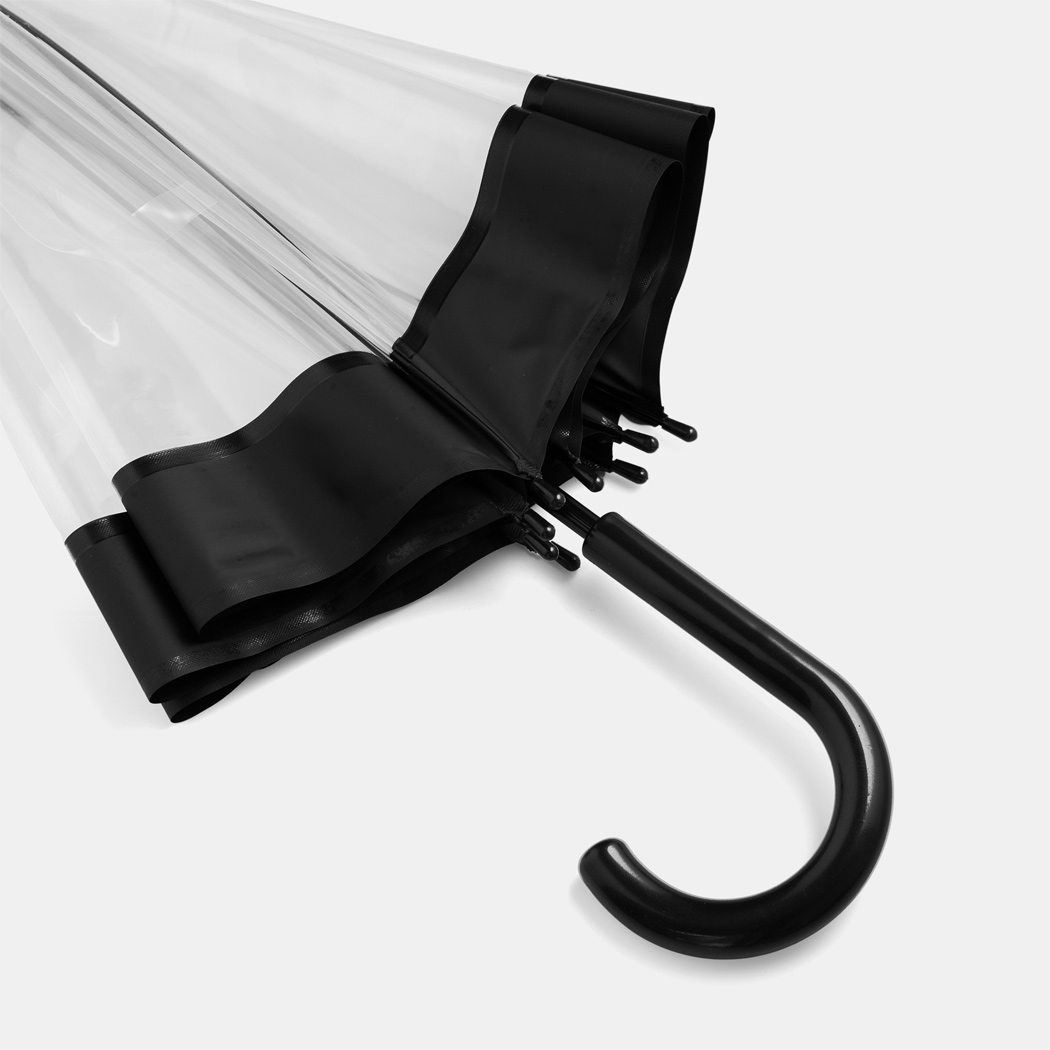 Glockenschirm HONEYMOON: Metallstock und –speichen, Kunststofftips und –spitze, Kunststoffrundhakengriff, transparente POE-Bespannung mit farbiger Bordüre, Schließband mit Druckknopf