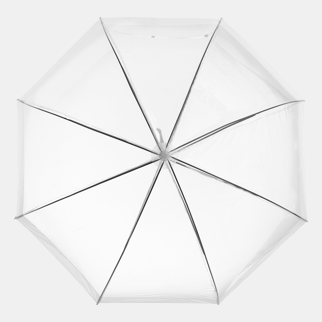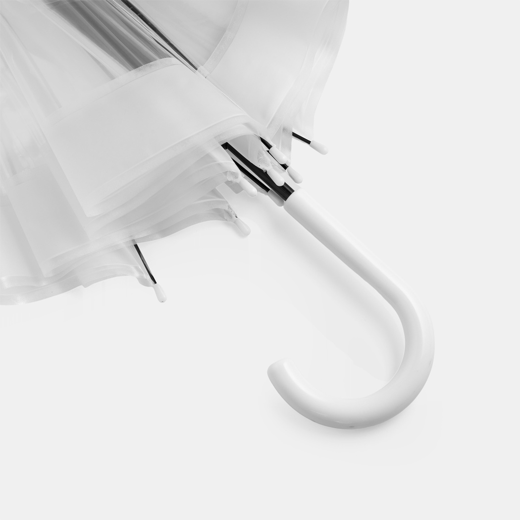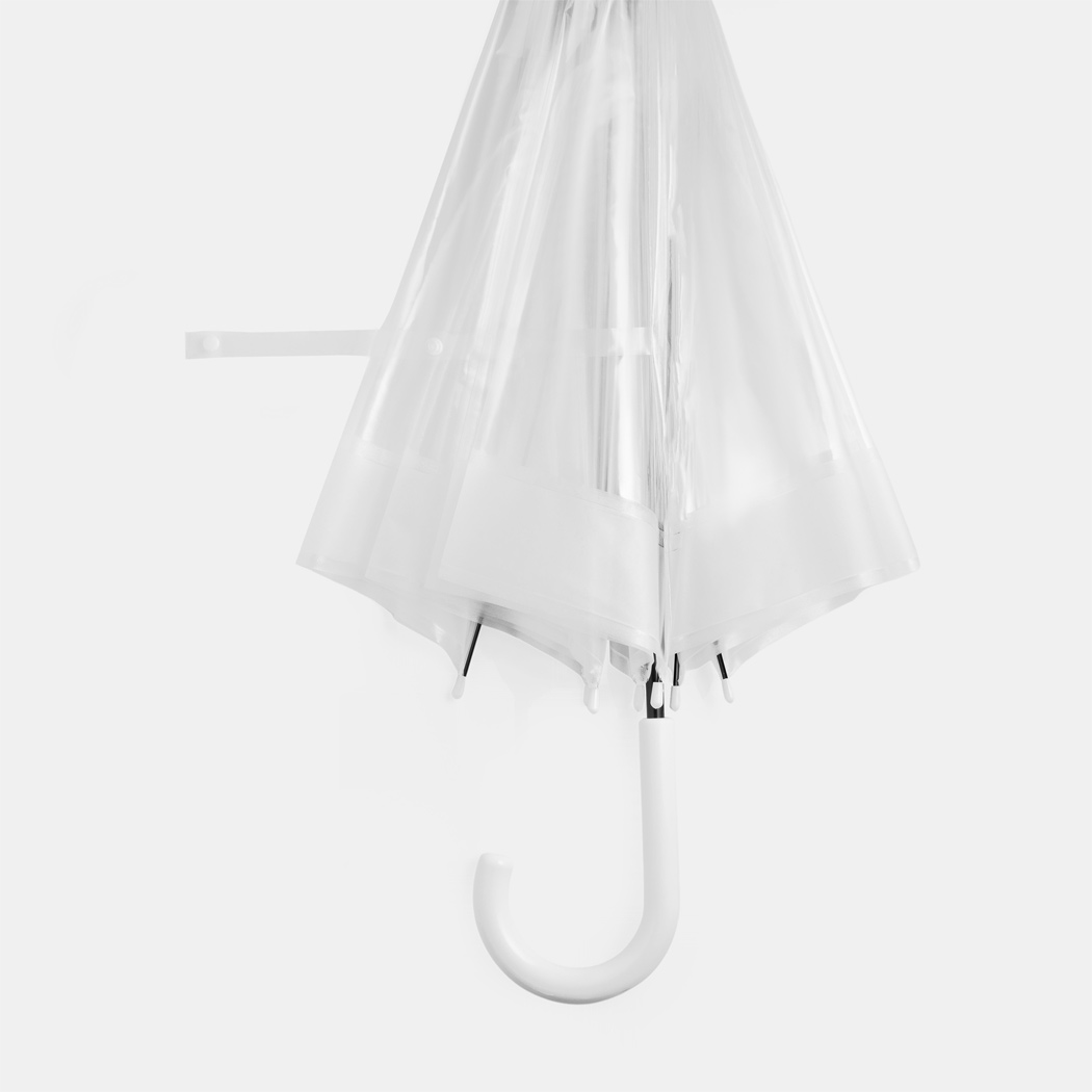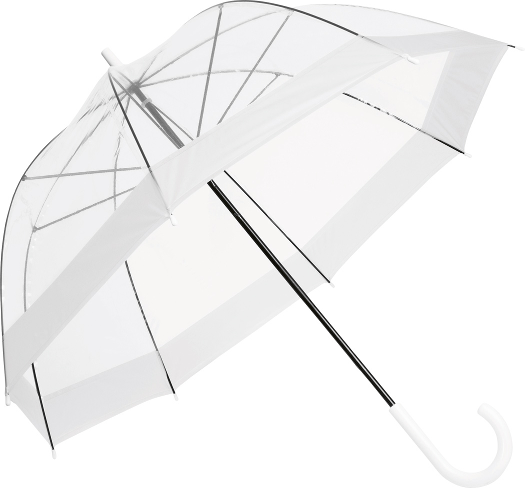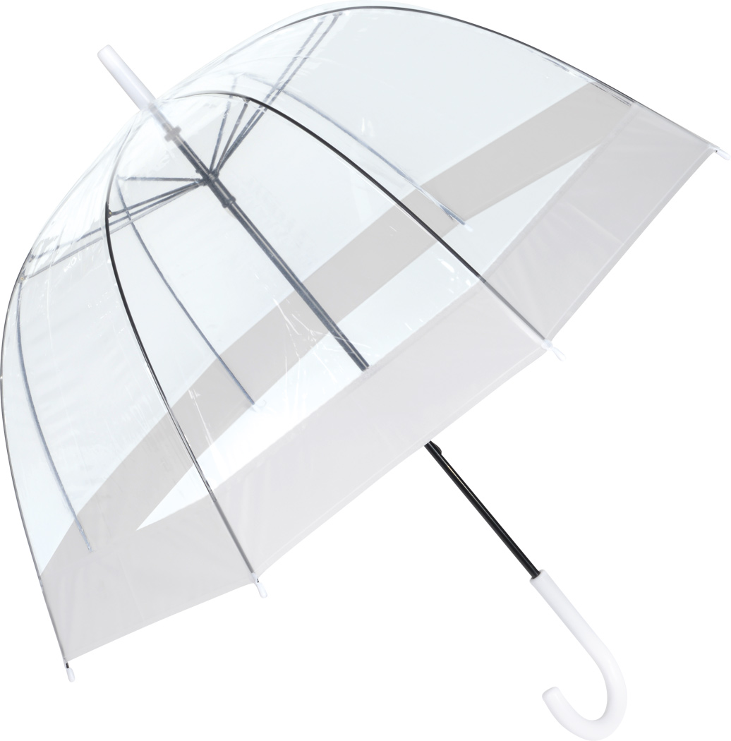Glockenschirm HONEYMOON: Metallstock und –speichen, Kunststofftips und –spitze, Kunststoffrundhakengriff, transparente POE-Bespannung mit farbiger Bordüre, Schließband mit Druckknopf
