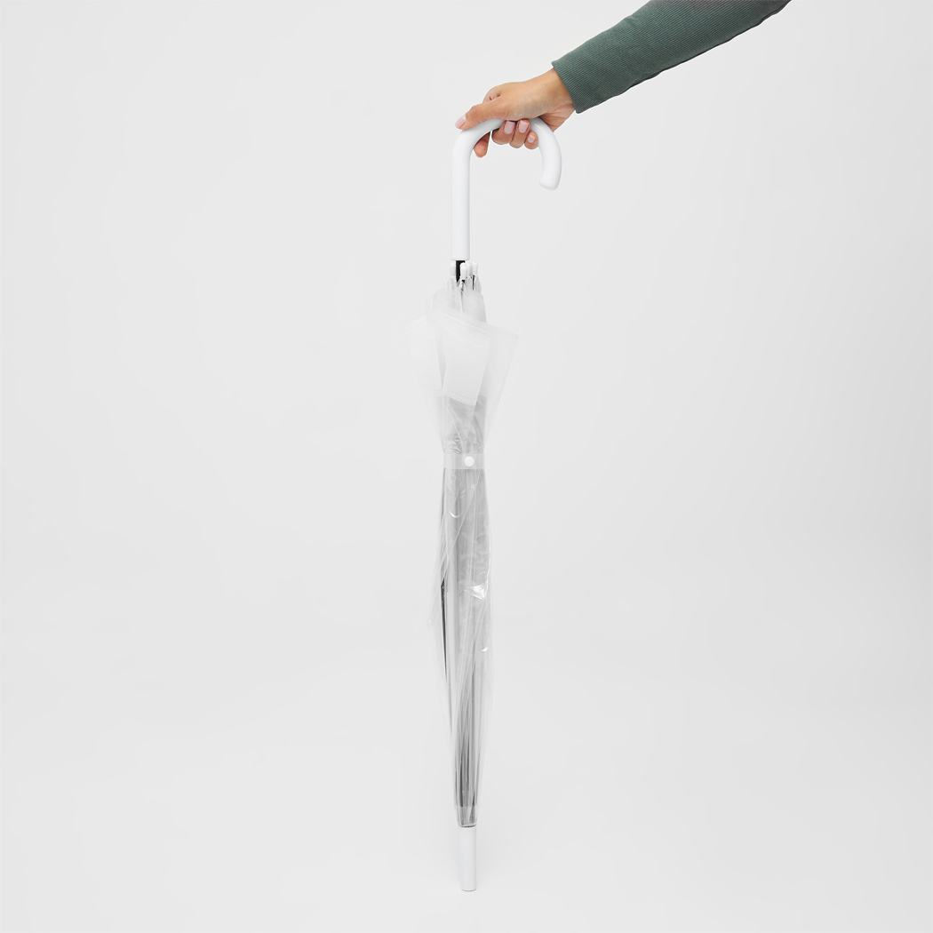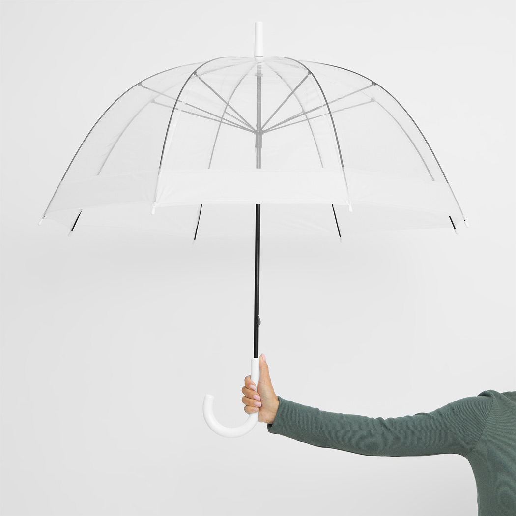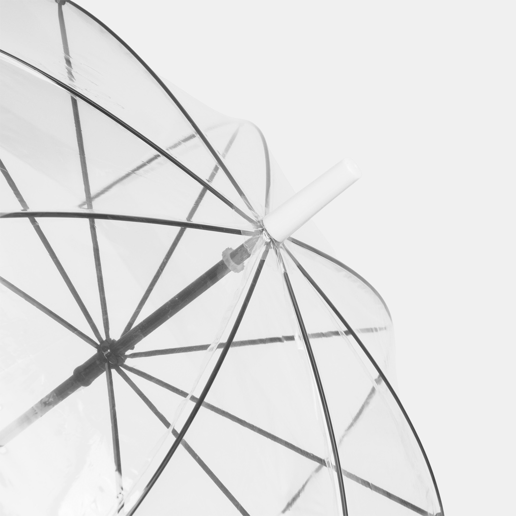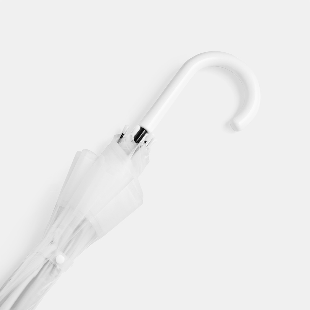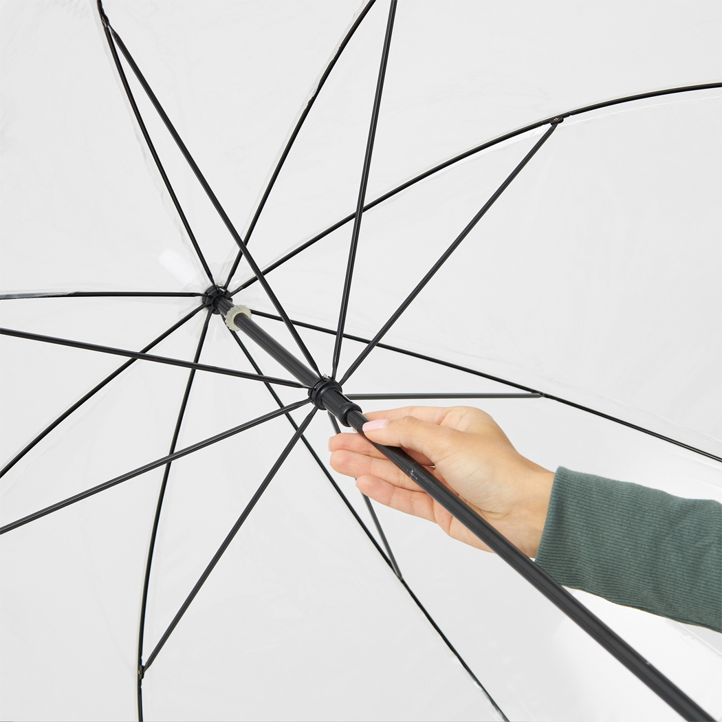 Glockenschirm HONEYMOON: Metallstock und –speichen, Kunststofftips und –spitze, Kunststoffrundhakengriff, transparente POE-Bespannung mit farbiger Bordüre, Schließband mit Druckknopf