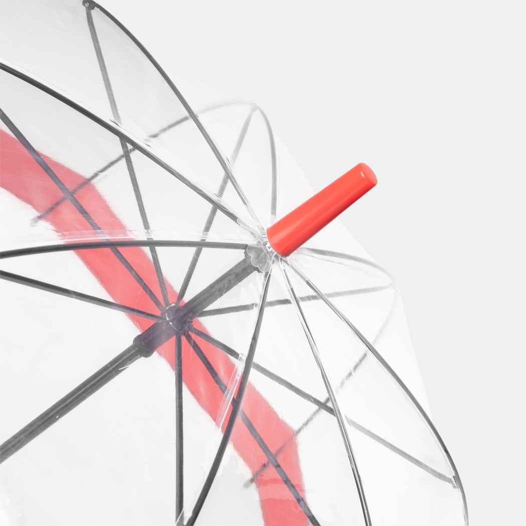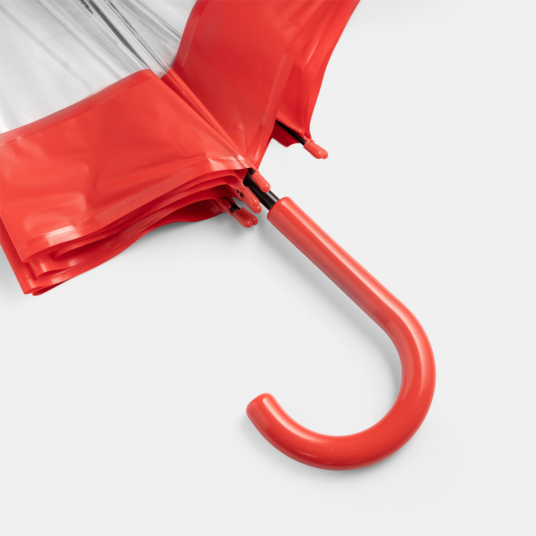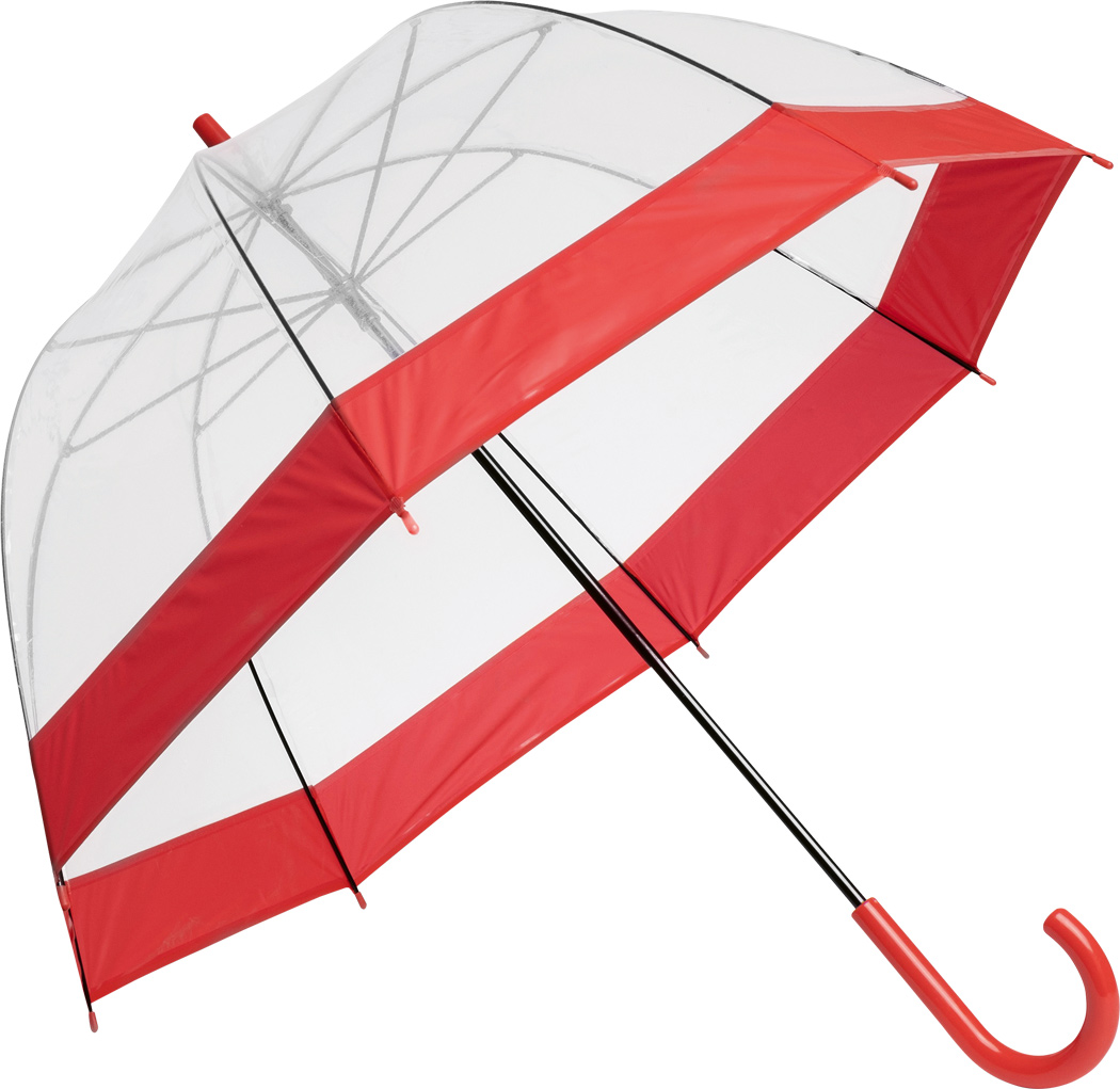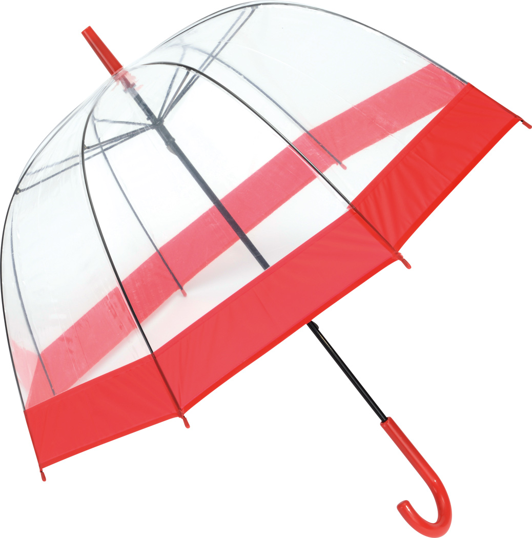 Glockenschirm HONEYMOON: Metallstock und –speichen, Kunststofftips und –spitze, Kunststoffrundhakengriff, transparente POE-Bespannung mit farbiger Bordüre, Schließband mit Druckknopf