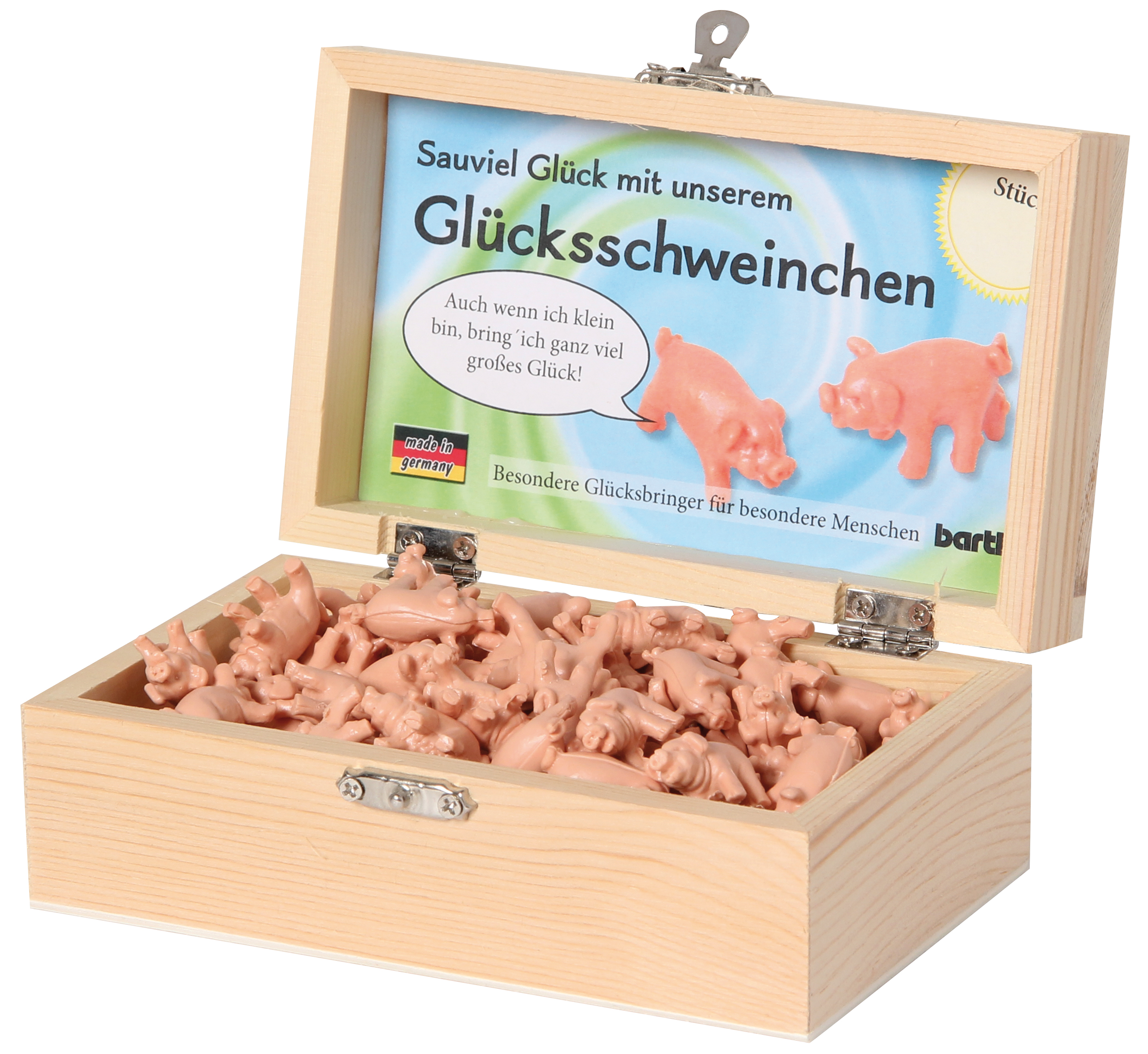 Holzkiste mit 100 Glücksschweinchen. Made in Germany.