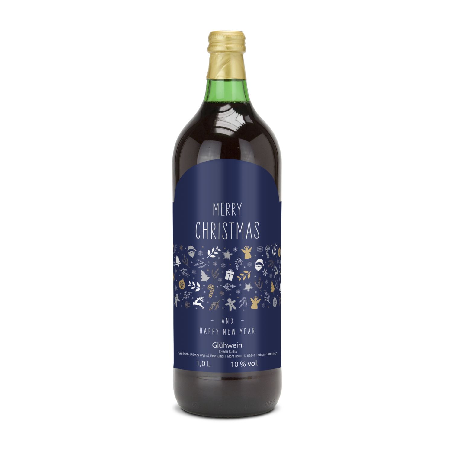 Informationen zu "Glühwein - Flasche grün, mit Schraubverschluss, 1 l - Motiv: Merry Christmas (blau)"