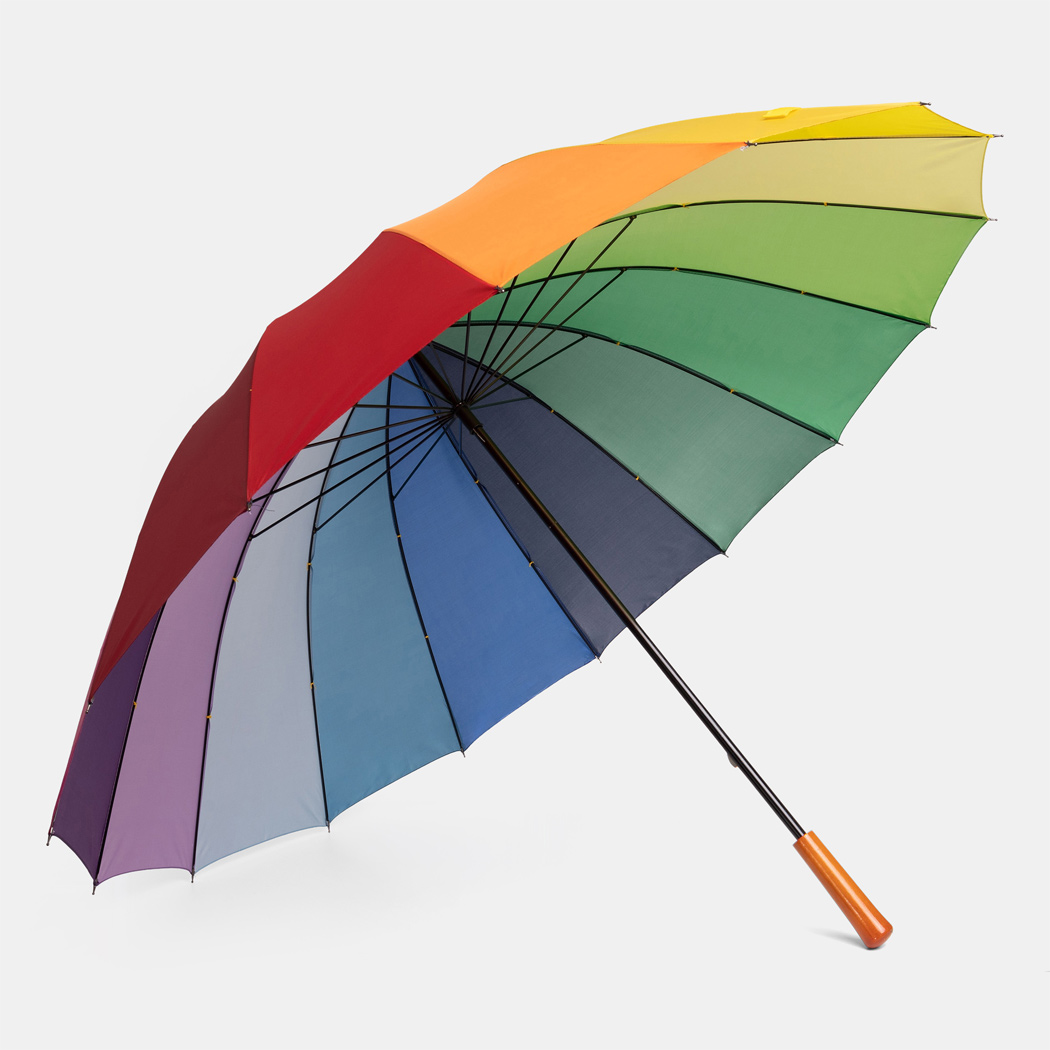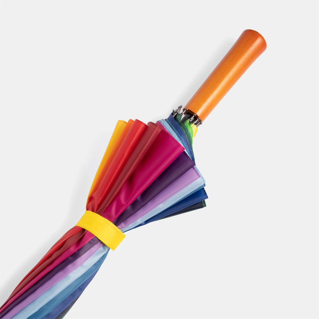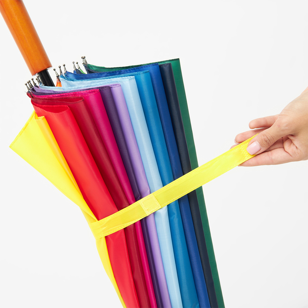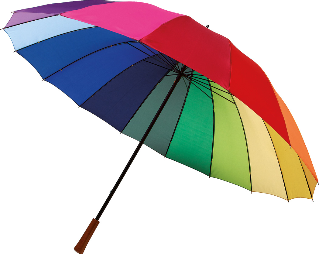 Golfschirm RAINBOW SKY: 16 Segmente, Metallstock, Metallspeichen und -tips, Holzgriff, Polyester-Bespannung, Schließband mit Klettverschluss