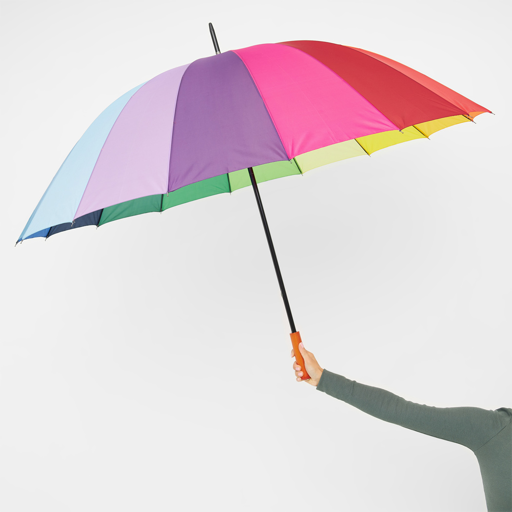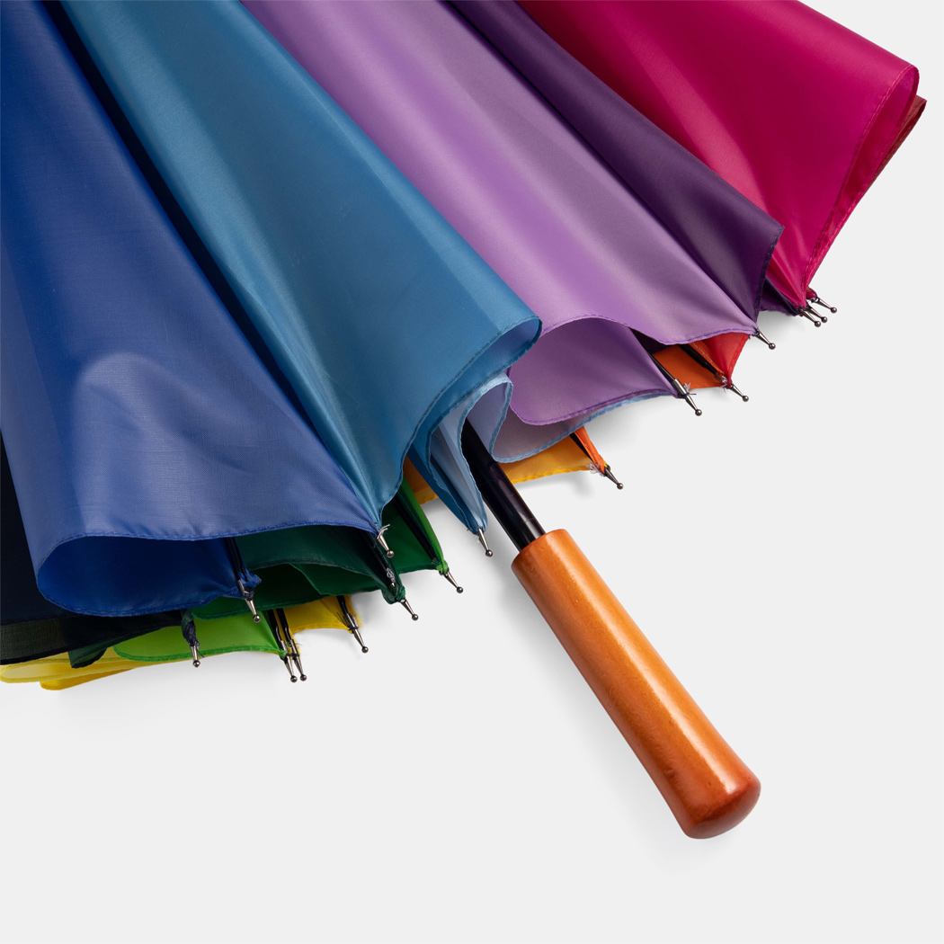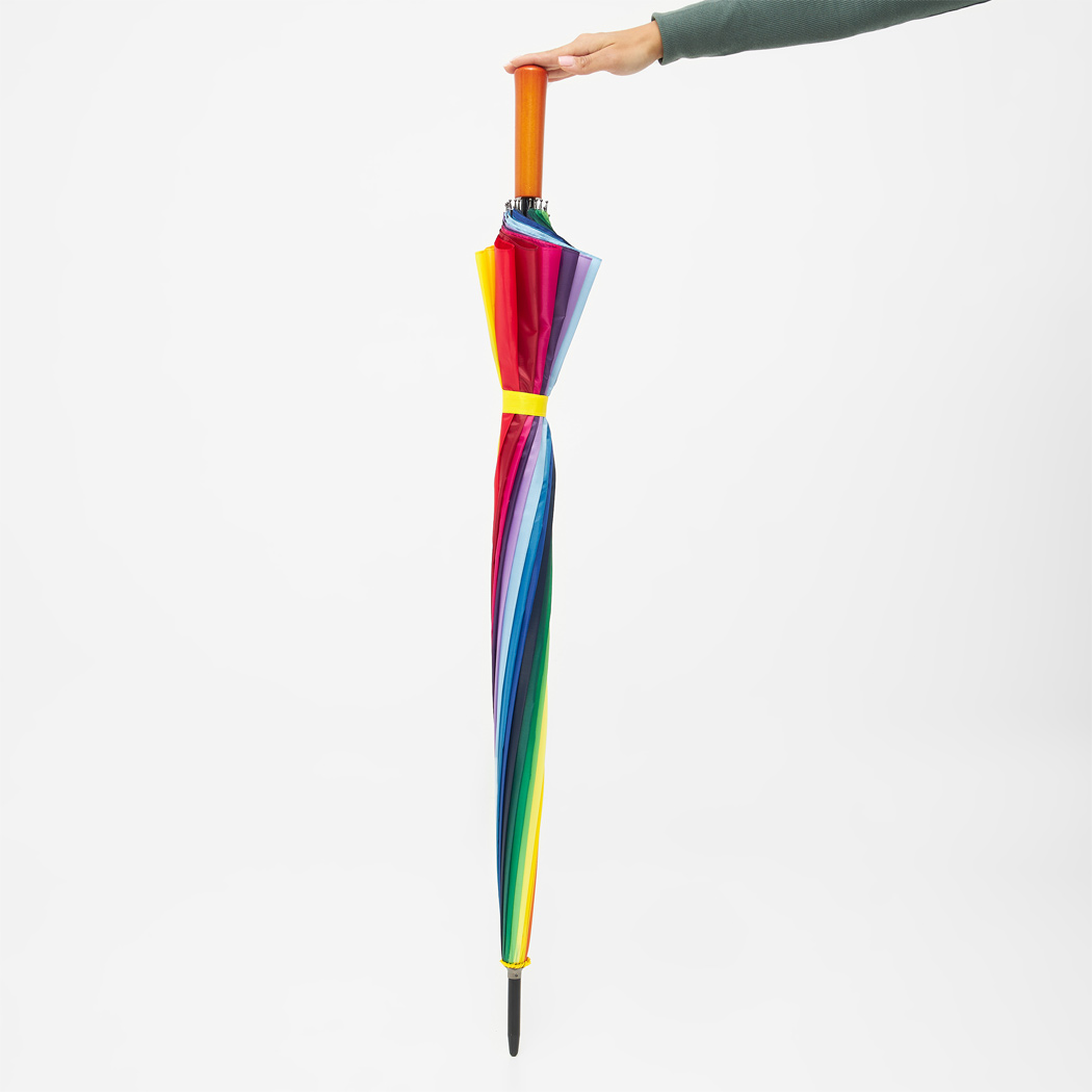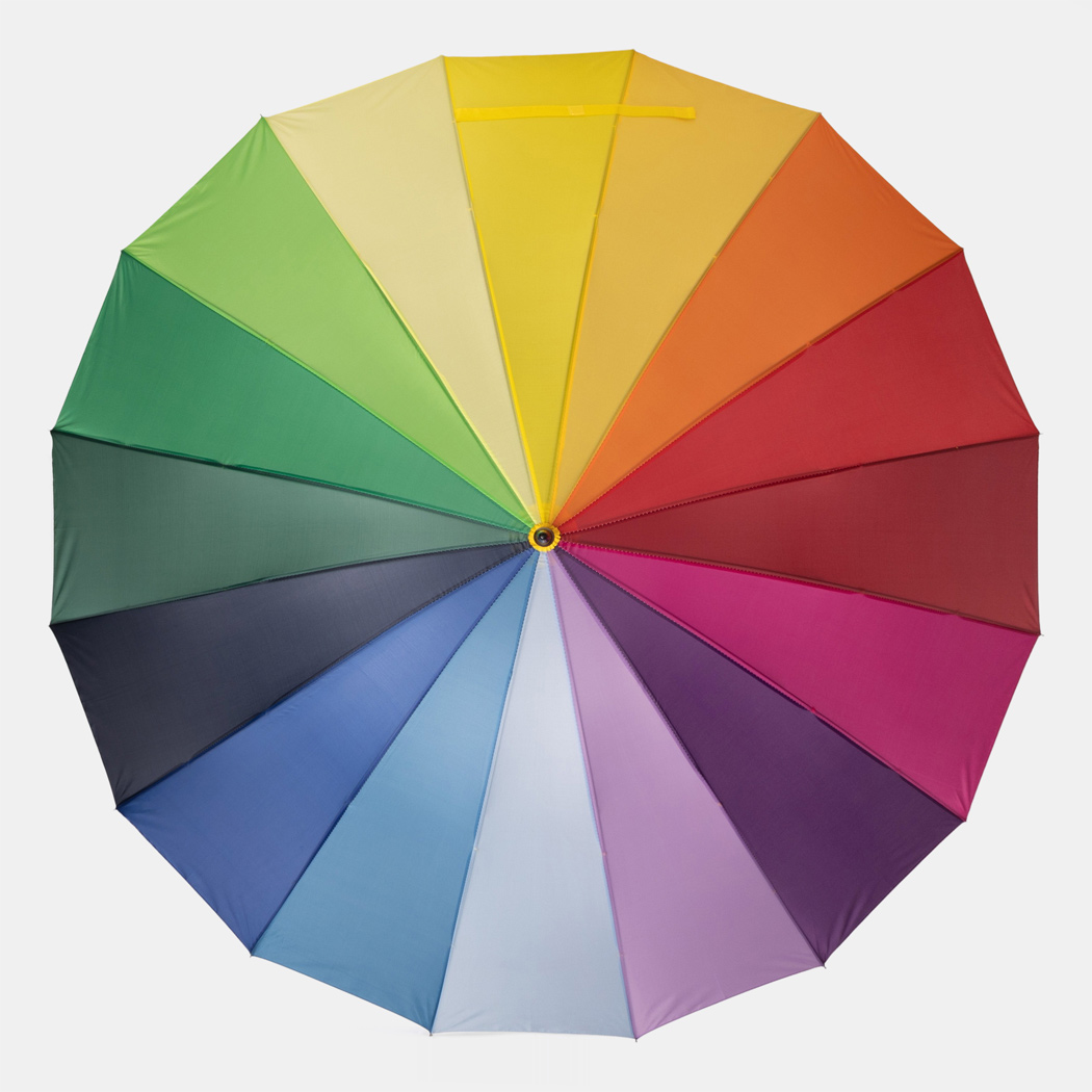 Golfschirm RAINBOW SKY: 16 Segmente, Metallstock, Metallspeichen und -tips, Holzgriff, Polyester-Bespannung, Schließband mit Klettverschluss