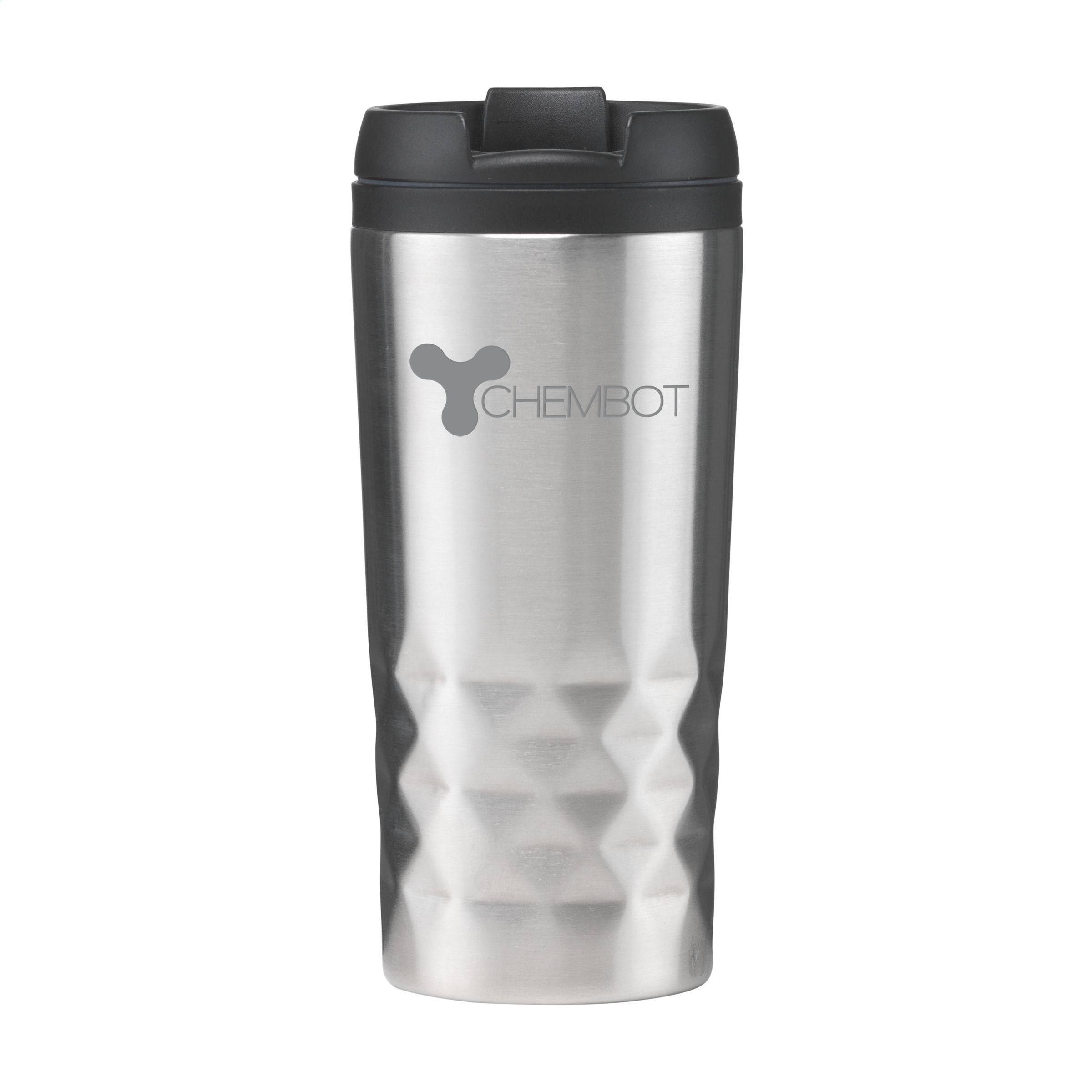 Doppelwandiger, auslaufsicherer Edelstahl-Thermobecher mit Schraubdeckel und Klicköffnung. PP-Innenwand. Mit auffallendem geometrischem 3D-Rautenmuster im Halter. Rutschfester Boden. Tropfsicher. Nicht spülmaschinengeeignet. Fassungsvermögen 300 ml. Wird einzeln in einem Kraftkarton geliefert.