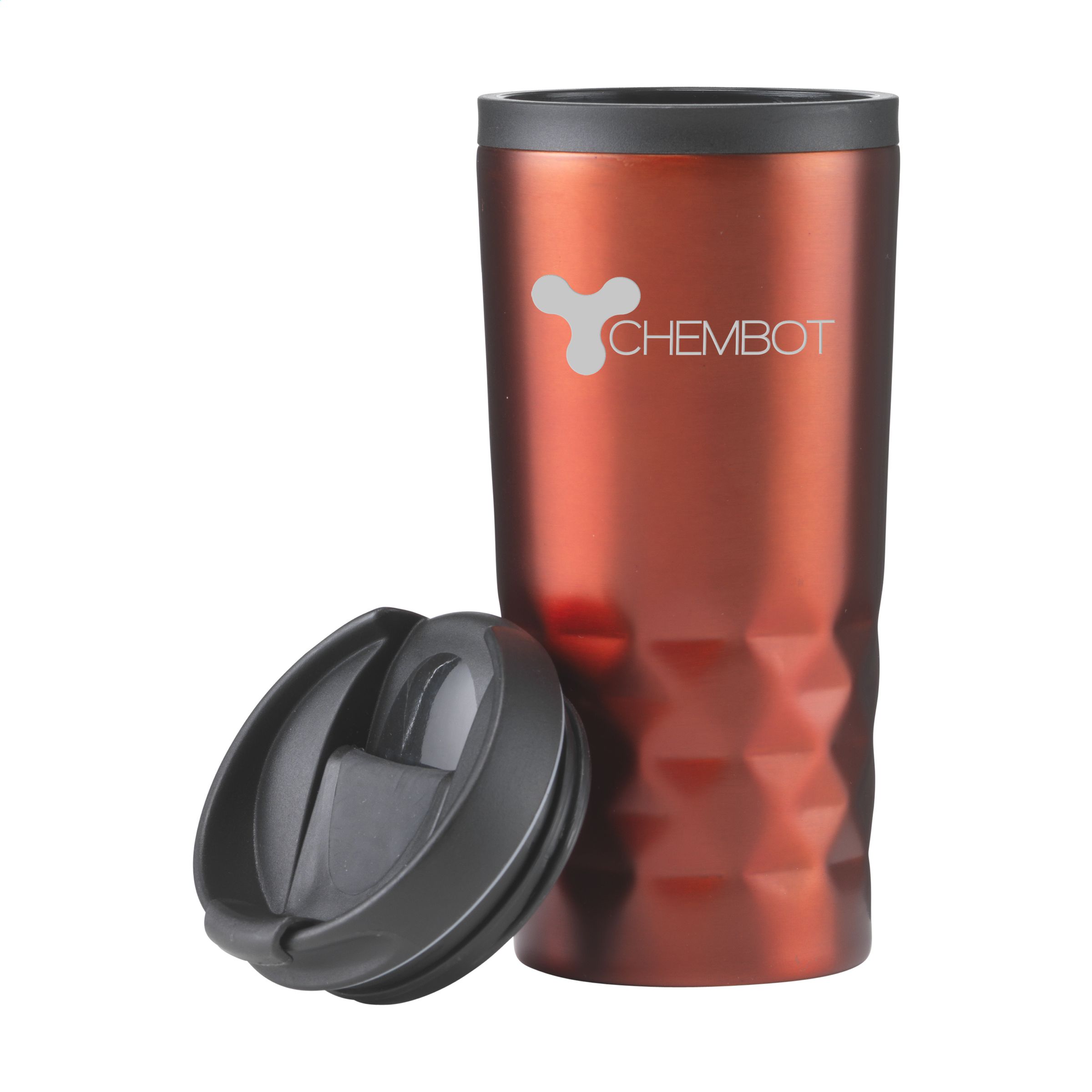 Doppelwandiger, auslaufsicherer Edelstahl-Thermobecher mit Schraubdeckel und Klicköffnung. PP-Innenwand. Mit auffallendem geometrischem 3D-Rautenmuster im Halter. Rutschfester Boden. Tropfsicher. Nicht spülmaschinengeeignet. Fassungsvermögen 300 ml. Wird einzeln in einem Kraftkarton geliefert.