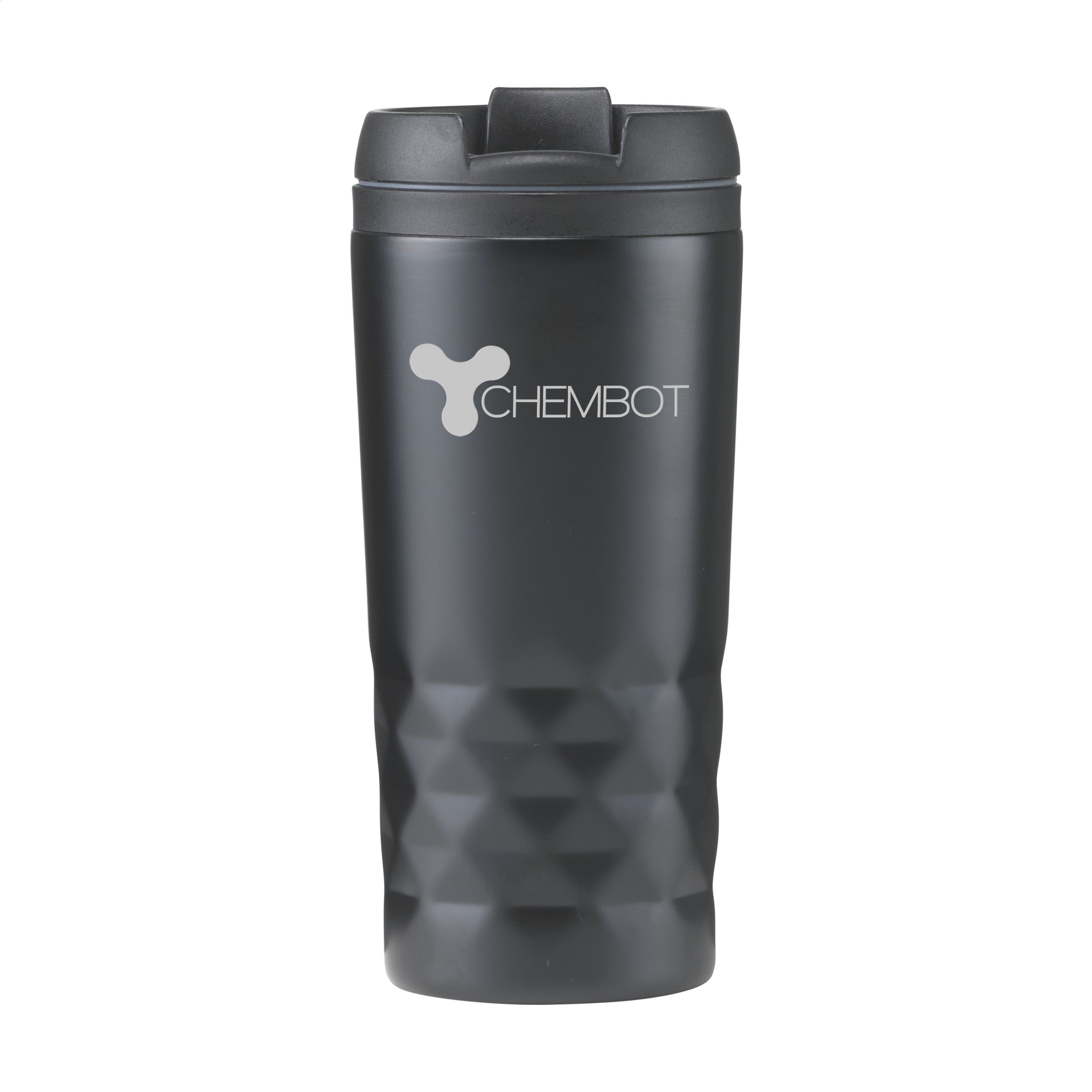Doppelwandiger, auslaufsicherer Edelstahl-Thermobecher mit Schraubdeckel und Klicköffnung. PP-Innenwand. Mit auffallendem geometrischem 3D-Rautenmuster im Halter. Rutschfester Boden. Tropfsicher. Nicht spülmaschinengeeignet. Fassungsvermögen 300 ml. Wird einzeln in einem Kraftkarton geliefert.