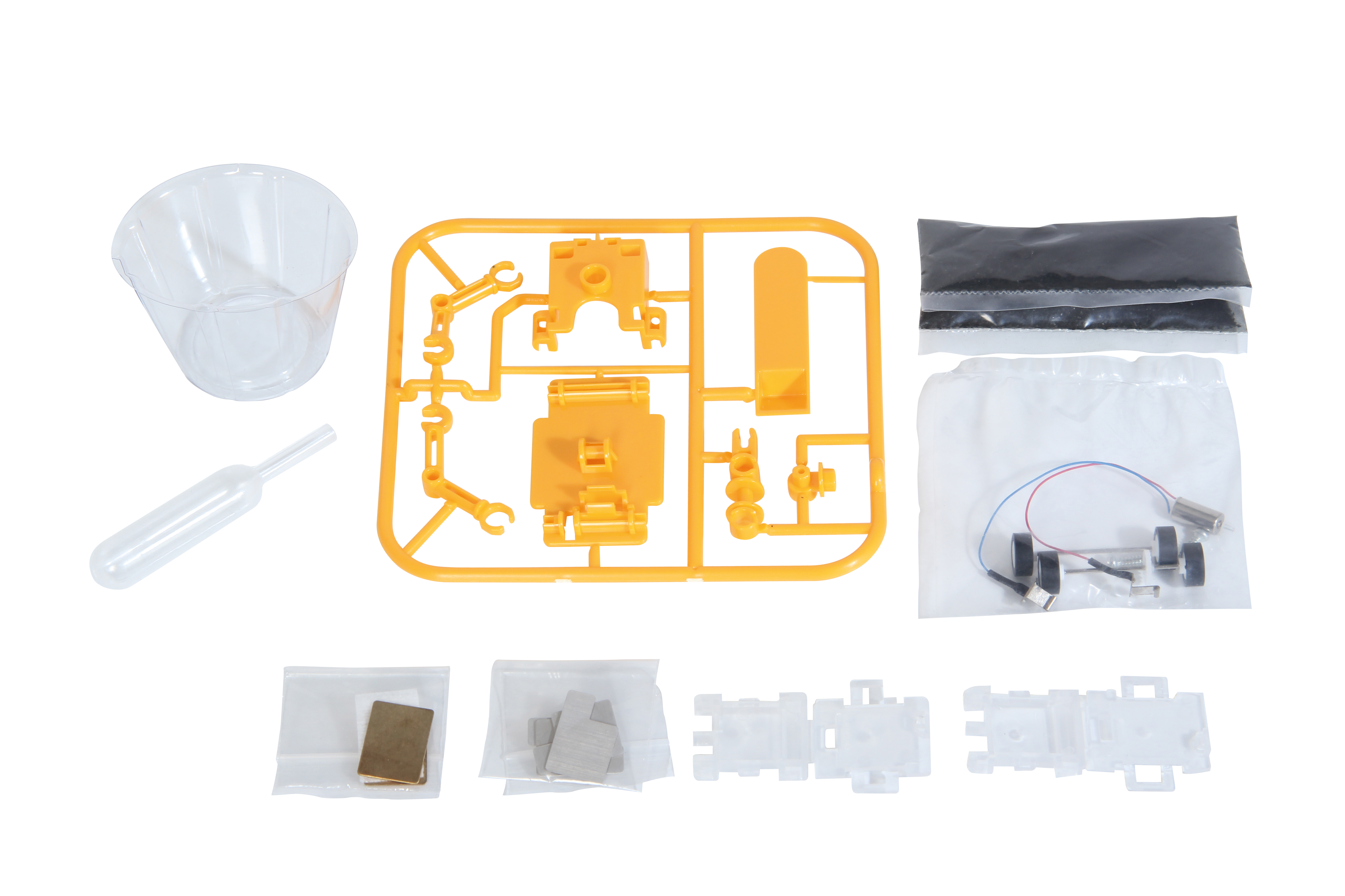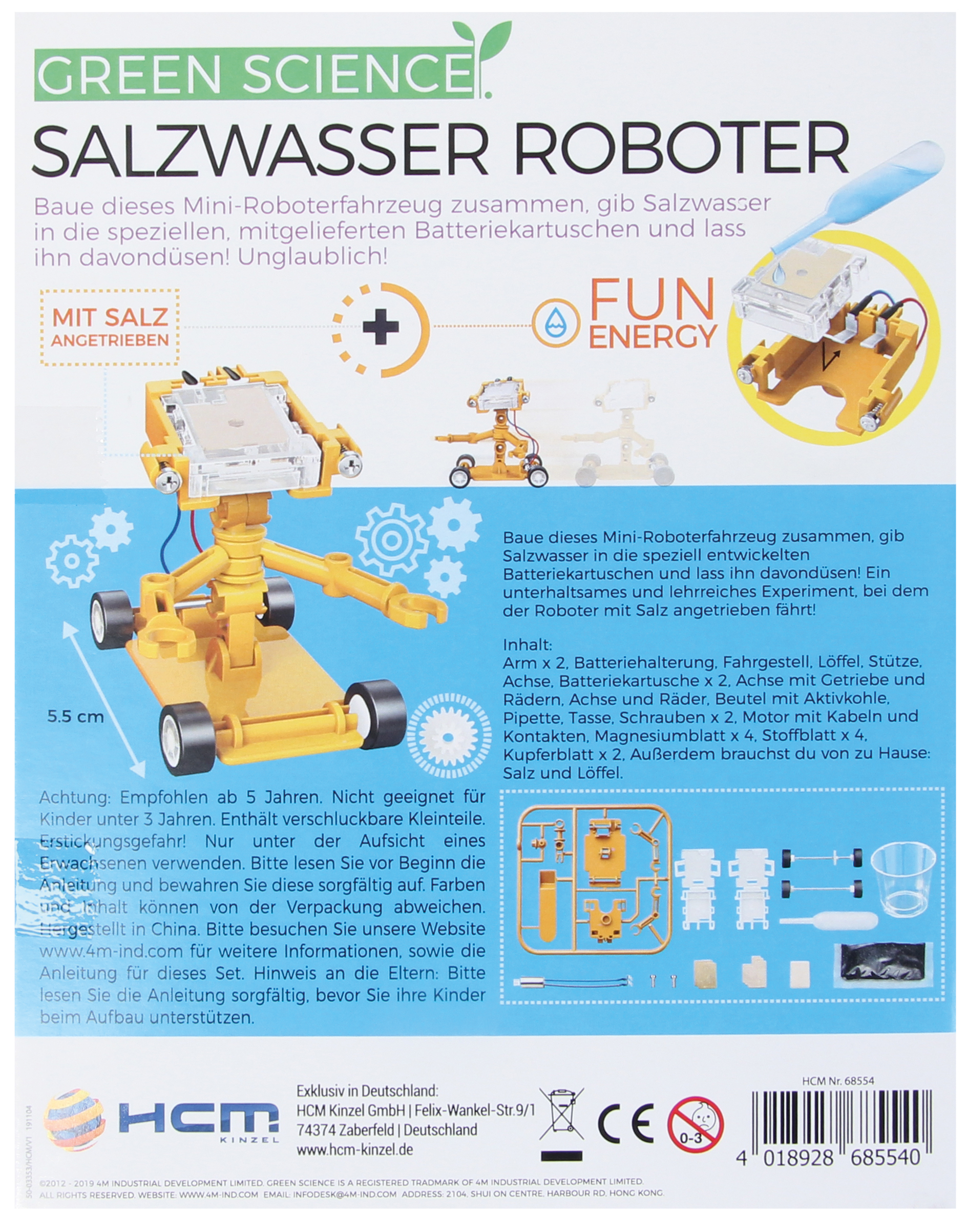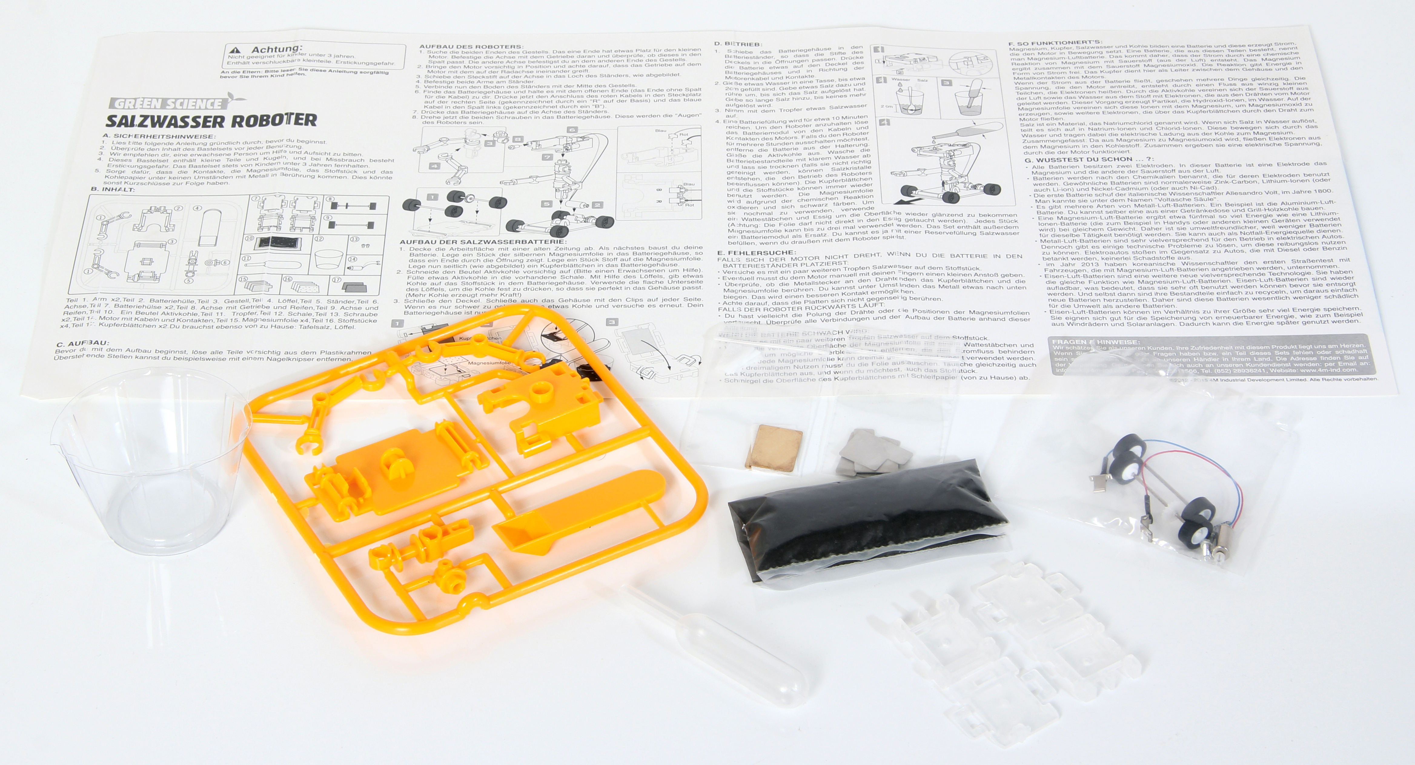 Spannender Bausatz für technisch interessierte Kids ab 8 Jahren mit Unterstützung eines Erwachsenen. Die Energie für den Antrieb entsteht nur durch das Zusammenwirken von Aktivkohle und Salzwasser. Es werden keine Batterien benötigt. Ein unterhaltsames und lehrreiches Experiment. Eine ausführliche Montageanleitung liegt bei.