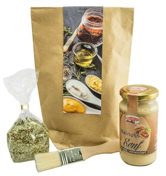 Tüte aus Naturpapier mit ca. 50 g Grill-Kräuter, 200 ml Walnuss-Senf und Marinierpinsel