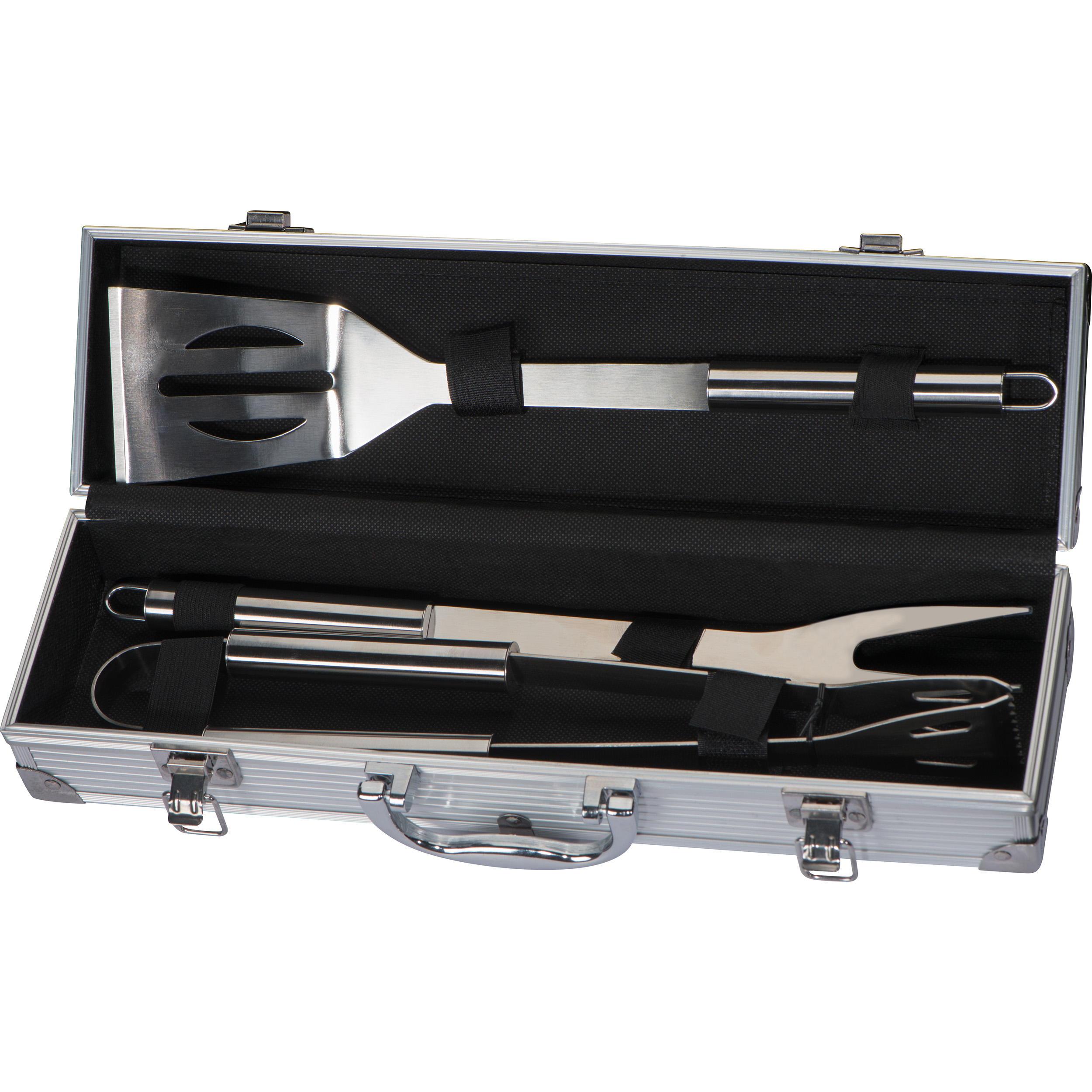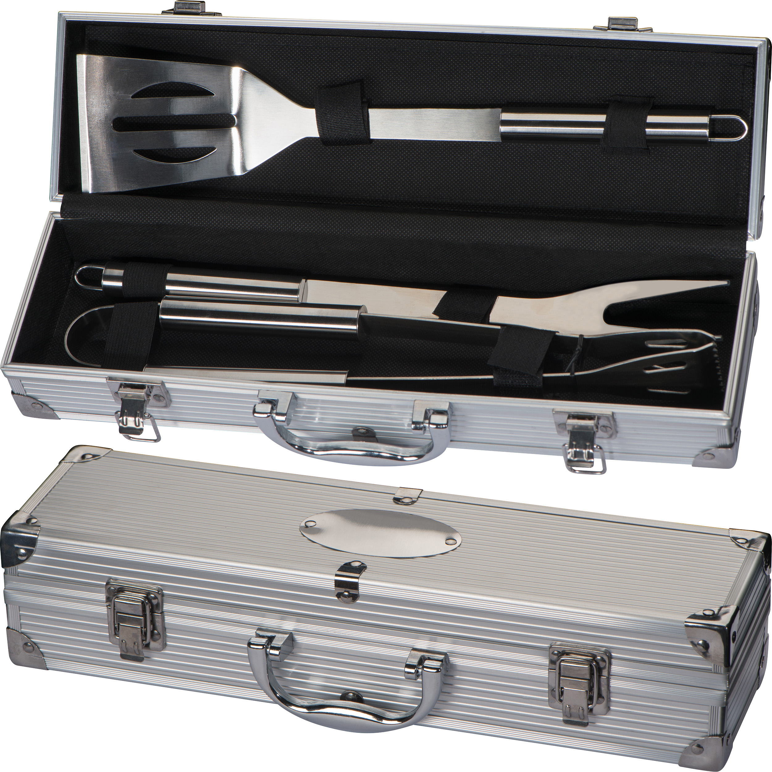 Grillkoffer aus Metall, verschließbar mit Tragegriff. Der Koffer beinhaltet einen Fleischwender, eine Grillgabel, sowie eine Grillzange. Die Werbung wird außen auf die Metallplatte gelasert.
