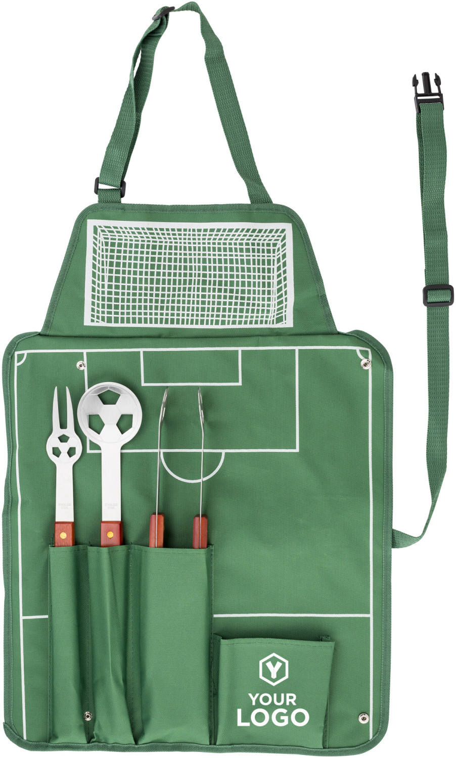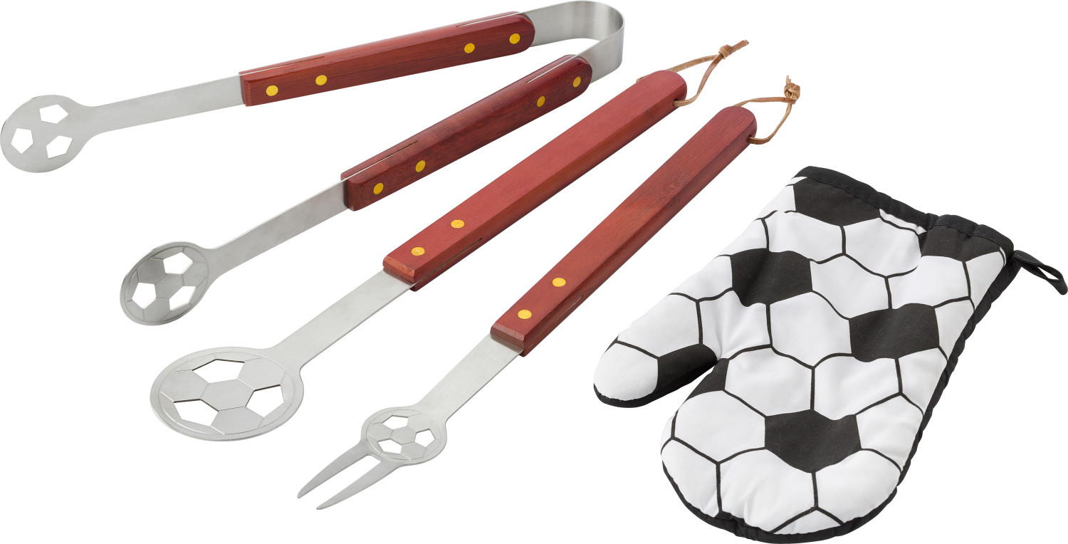 4-teiliges Grillset bestehend aus einer grünen Schürze mit weißem Fußballfeld-Aufdruck, einer Fleischgabel, einem Wender und einer Zange aus Aluminium mit Holzgriffen und Fußball-Stanzung.