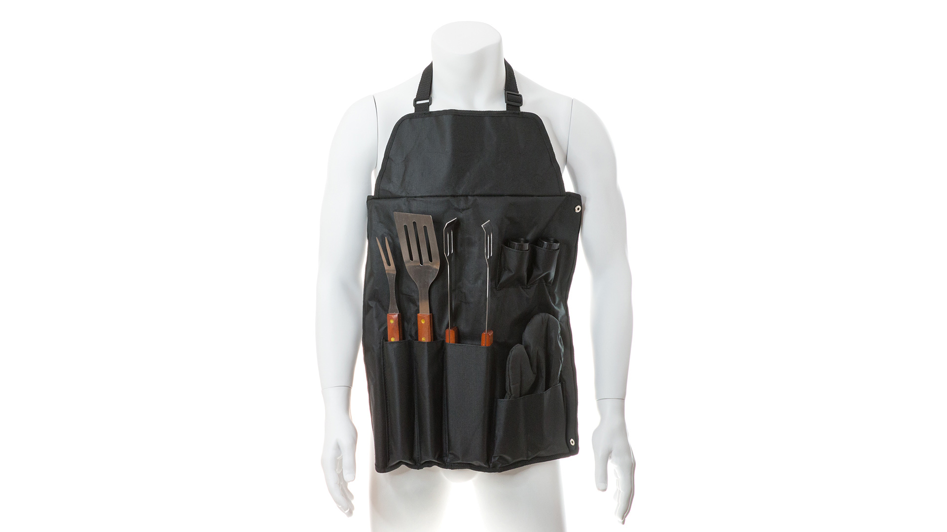 7-teiliges Grill-Set mit Wender, Fleischgabel und Zange aus Edelstahl mit Holzgriff sowie gepolsterten Handschuhen und Salz- und Pfefferstreuer. Präsentiert in einem robusten 600D Polyester-Etui in Schwarz mit Metallknopfverschluss. Mit verstellbarem Tragegurt aus robustem Nylon mit Klickverschluss.