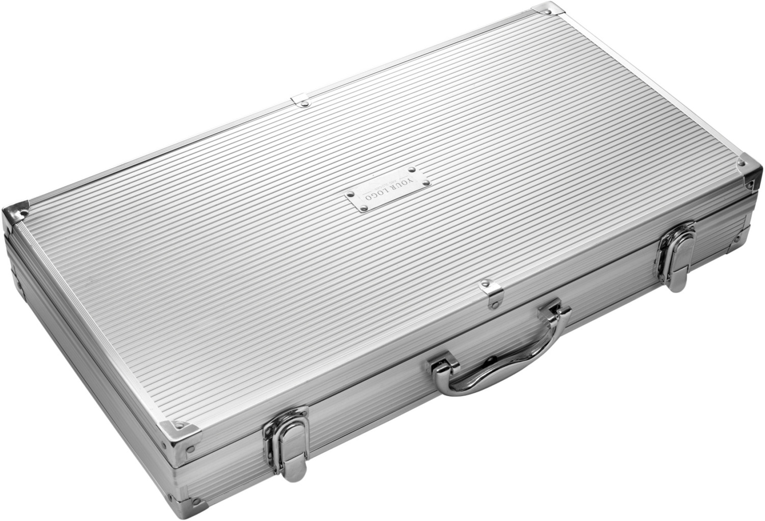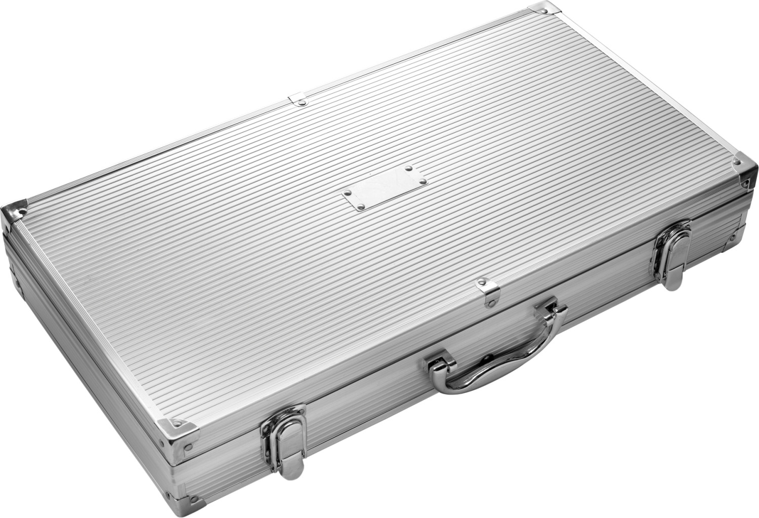 Grillset aus Edelstahl, bestehend aus Zange, Wender, Fleischgabel, Messer, 2 Hähnchenspießen, 2 Grillbürsten und 8 Partyspießen in einem Aluminiumkoffer.