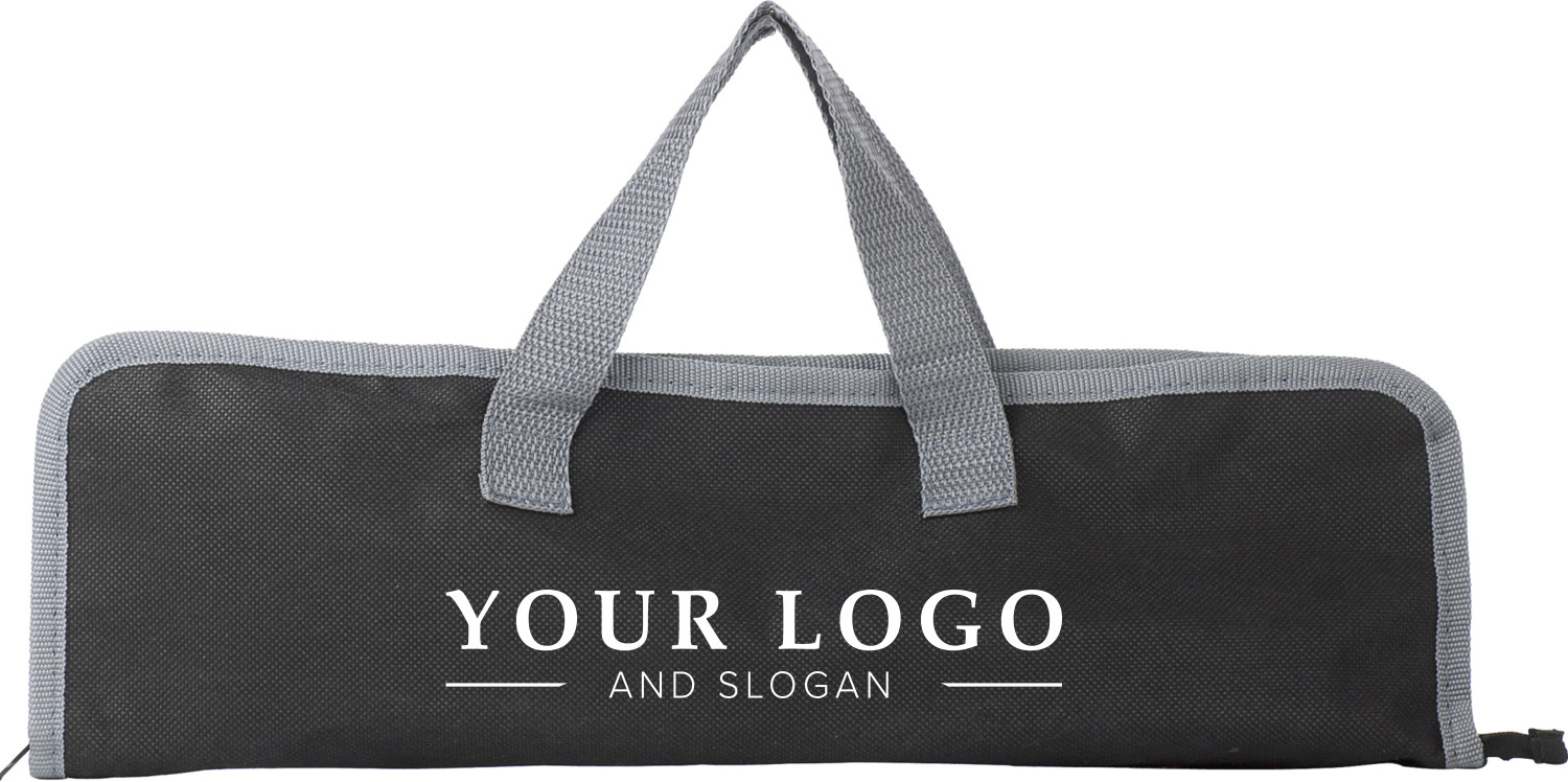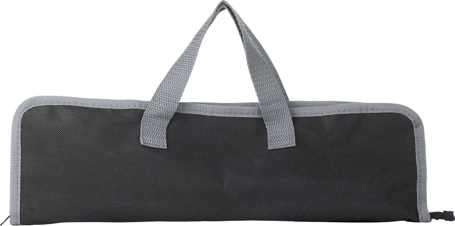 Grillset aus Edelstahl, bestehend aus Zange, Wender, Fleischgabel und Etui aus Non-Woven mit Reißverschluss und Tragegriffen.